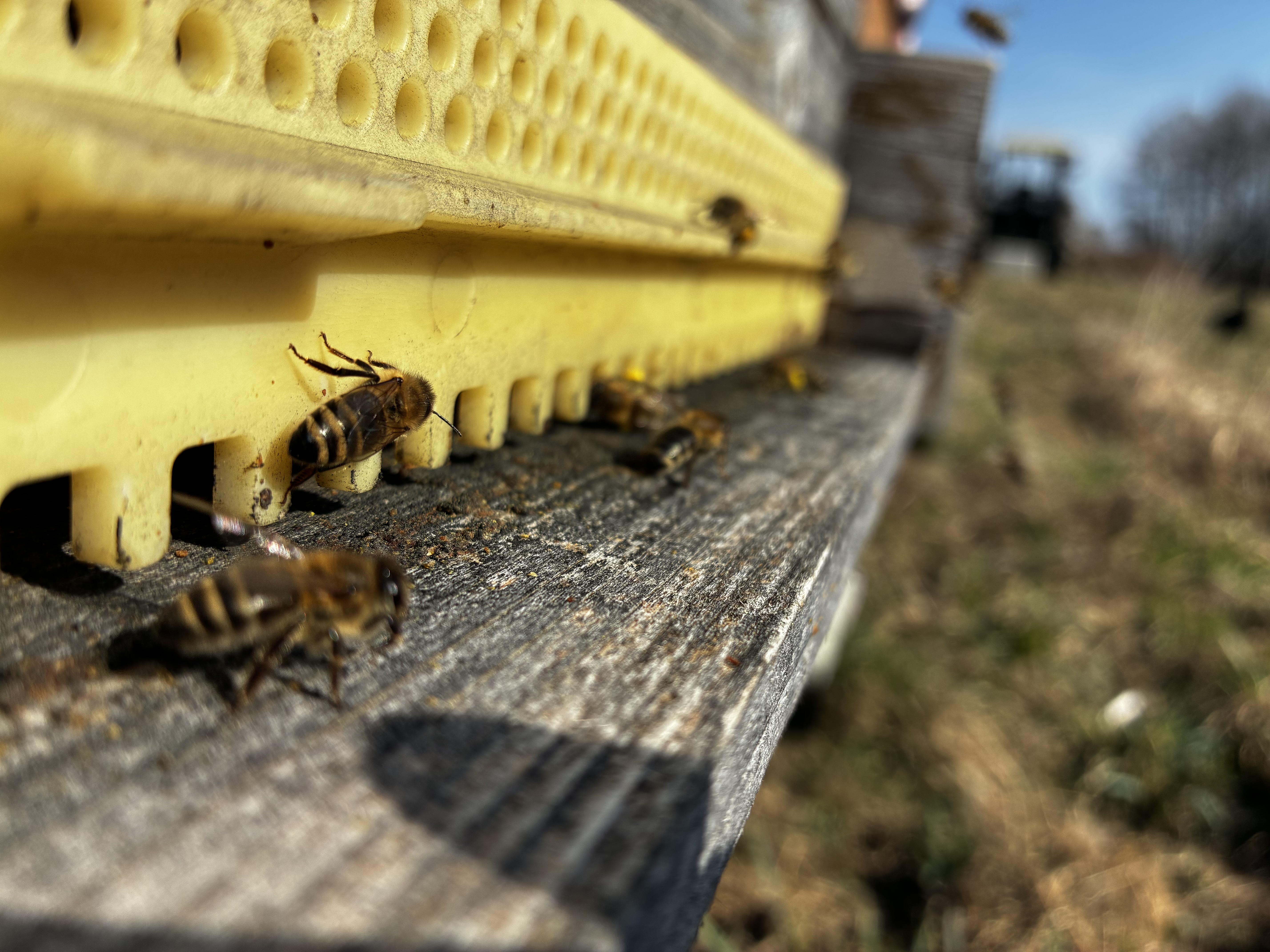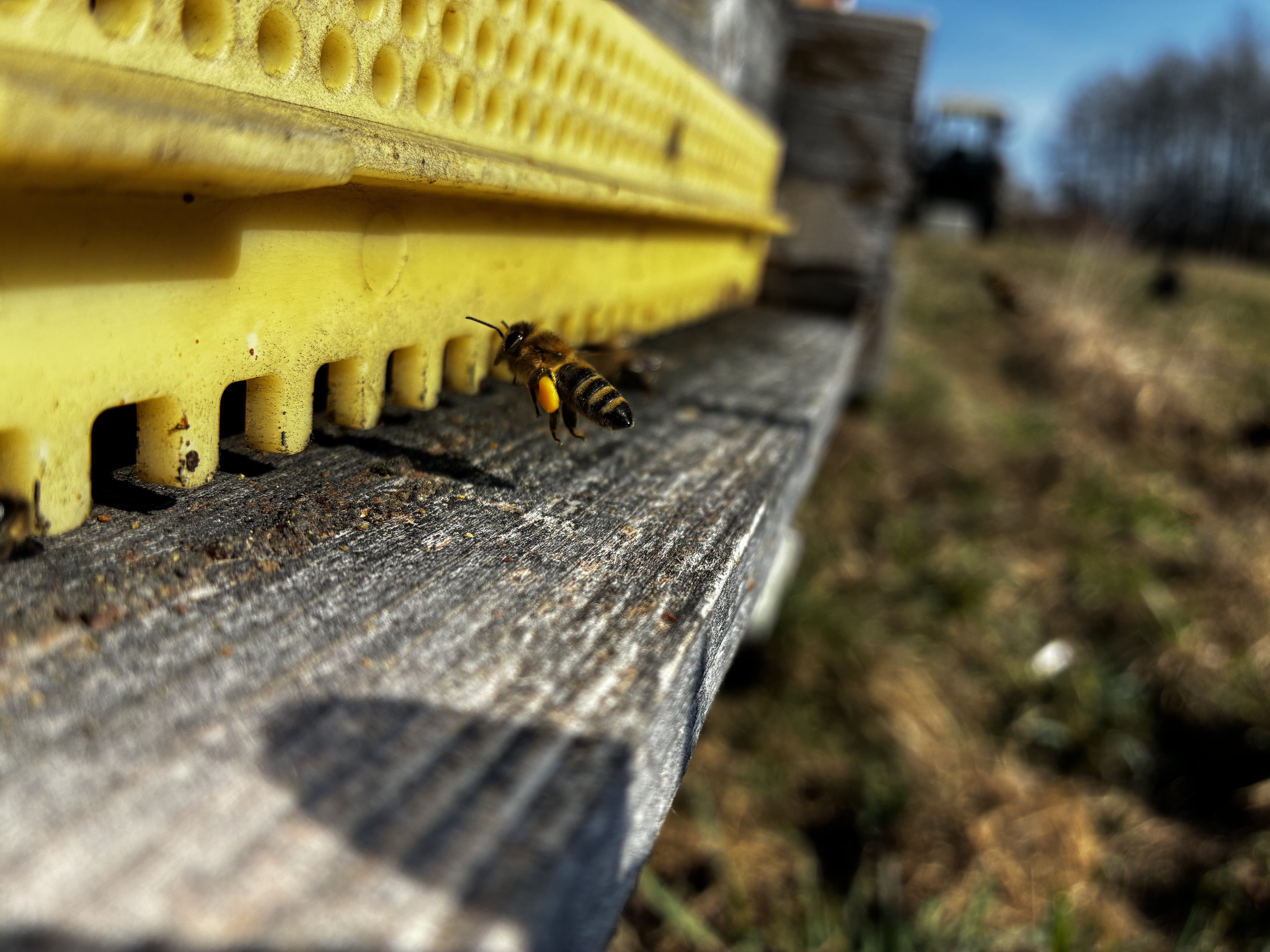 Mit Anfang März machen sich nicht nur die Sonnenstrahlen bei uns bemerkbar, auch die ersten Frühjahrsblüher wie Schneeglöckchen und Primeln lassen sich blicken. Mit den steigenden Temperaturen erwacht auch das VAV-Bienenvolk aus dem Winterschlaf und macht die ersten Flüge - Zeit für eine Fluglochkontrolle. Wieviel sich am Flugloch abspielt, spiegelt die Volksstärke wieder. Die VAV-Bienen haben auch schöne Pollenhöschen, sie tragen also auch bereits fleißig Pollen zur Brutentwicklung in den Bienenstock ein - die Volksentwicklung sieht also gut aus!