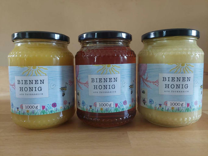 Jeder Honig schmeckt einzigartig. Je nach Tracht (Angebot an Nektar, Pollen und Honigtau) unterscheidet er sich in Geschmack und Farbe. Blütenhonig besteht hauptsächlich aus Blütennektar verschiedener Pflanzen und schmeckt deshalb zu jeder Zeit des Jahres und in jeder Region etwas anders. Waldhonig hingegen wird aus dem Honigtau gewonnen. Dieser von pflanzensaugenden Insekten ausgeschiedene Saft wird von den Bienen gesammelt. Waldhonig hat eine dunklere Farbe, Blütenhonig ist (je nach Sorte) deutlich heller. Oft hat Waldhonig eine festere Konsistenz, bleibt jedoch länger flüssig als Blütenhonig. Um das rasche Kristallisieren des Blütenhonigs zu verhindern, haben wir ihn cremig gerührt. Dabei rührt man den Honig jeden Tag ein paar Minuten, lässt ihn wieder ruhen und rührt am nächsten Tag weiter. Beim Rühren werden die Zuckerkristalle gebrochen, und der Honig bleibt cremig.