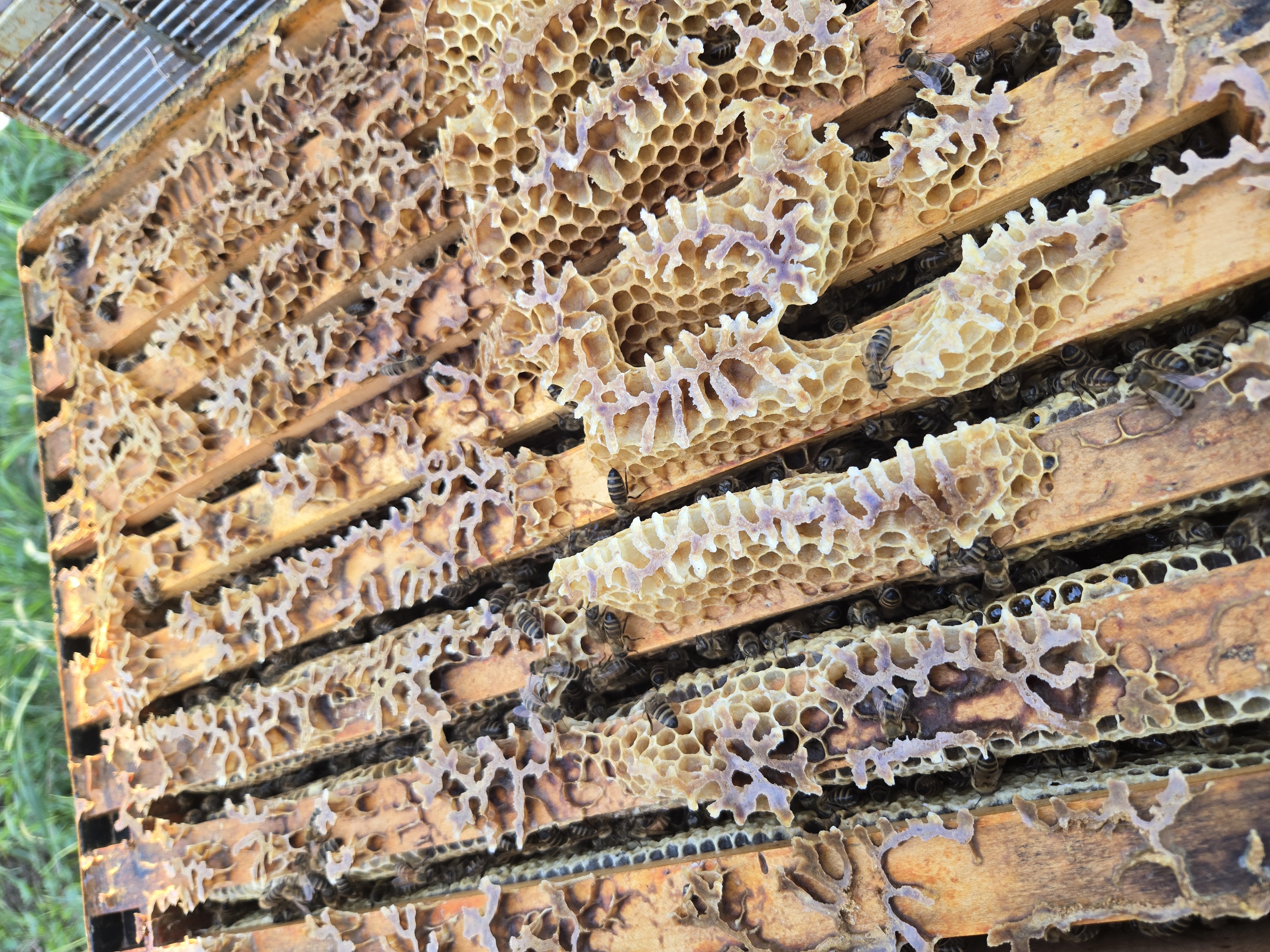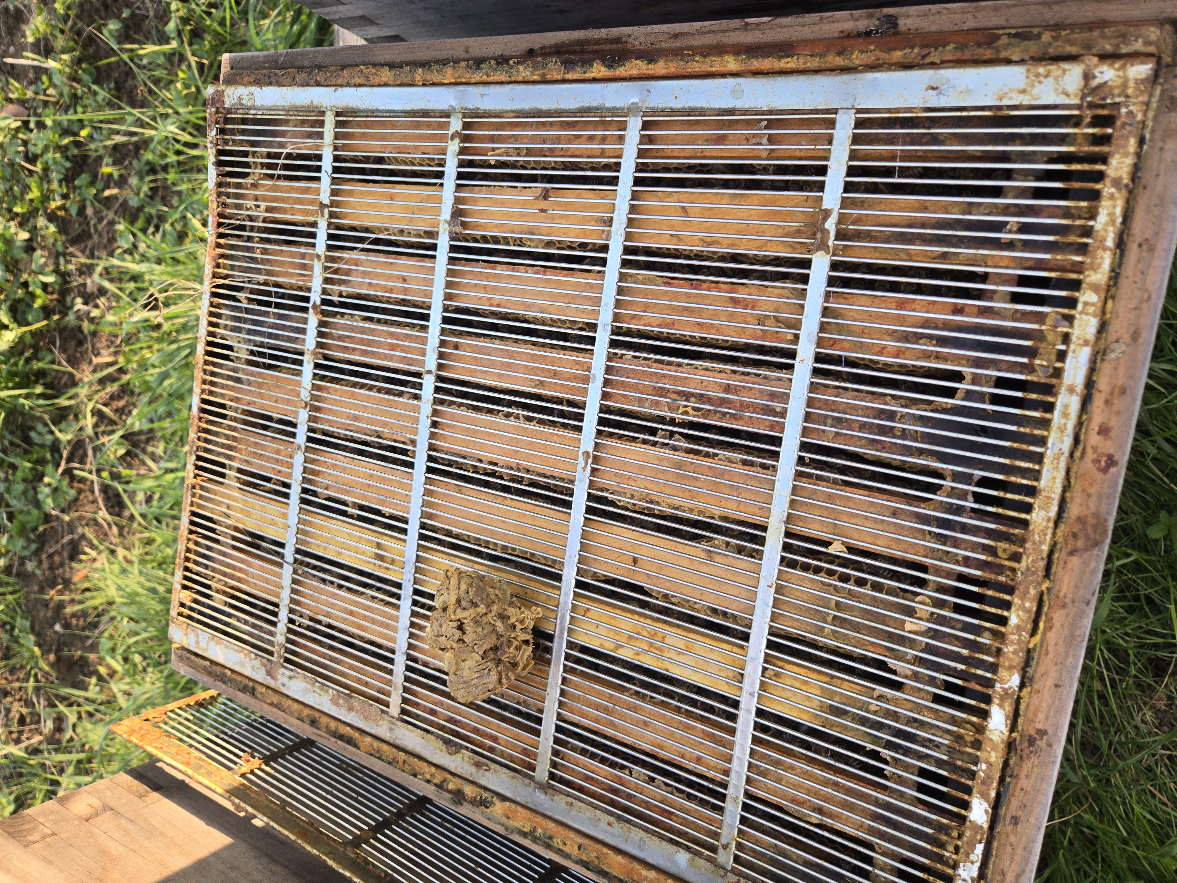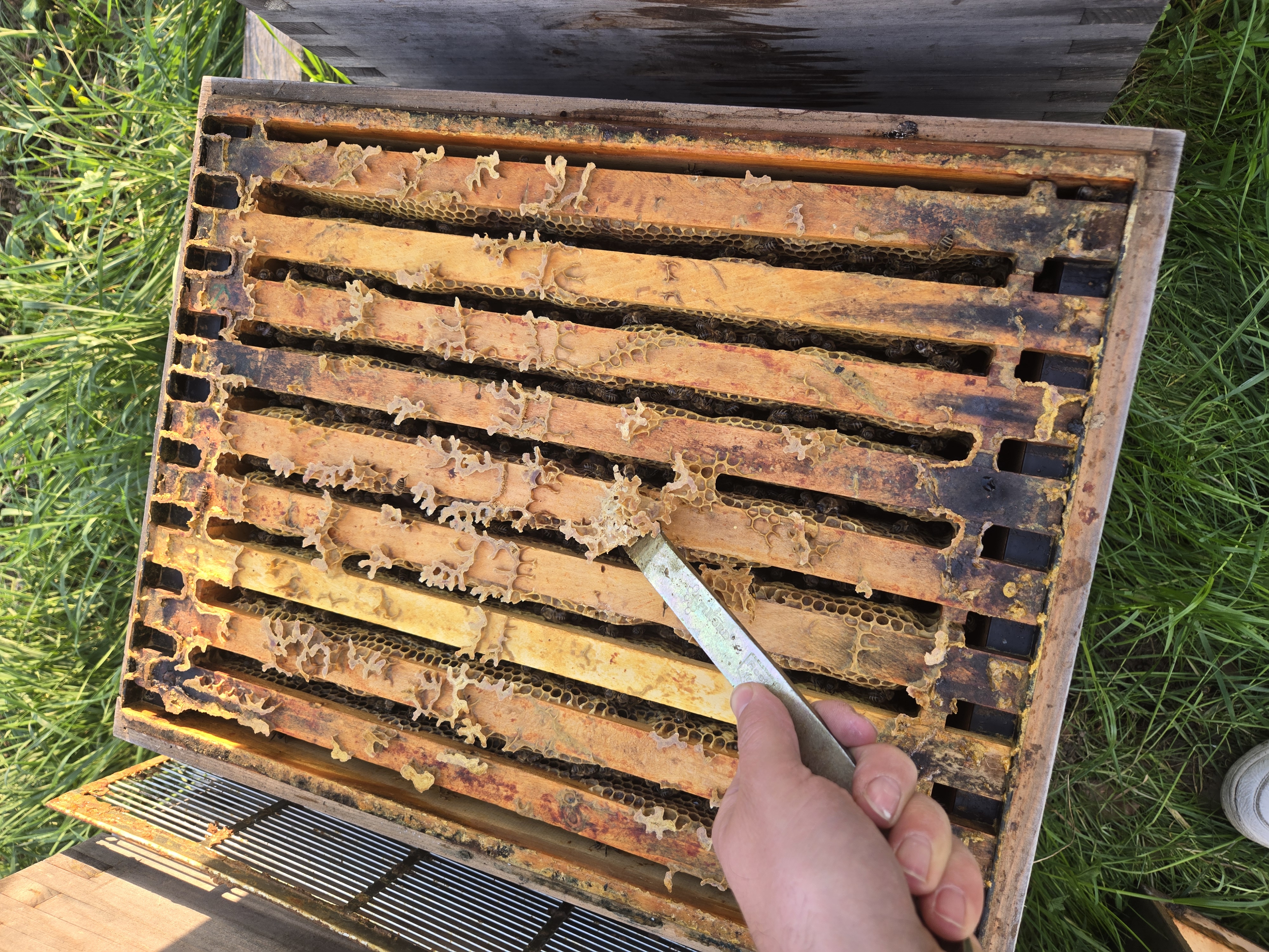 Der März war zu Beginn schon schön warm. Da keine Nachtfröste mehr prognostiziert wurden und die Bienen sich aufgrund der wärmeren Temperaturen selbst wehren können, konnte ich die Mäusegitter entfernen. Die Absperrgitter zwischen Brutraum und Honigraum wurden abgekratzt und gereinigt. Auch der Wachsüberbau auf den Rähmchen-Oberteilen wurde entfernt, damit mit dem Gitter keine Bienen gequetscht werden. Sobald die Kirsche blüht, werden die Honigräume mit leeren Waben gefüllt.