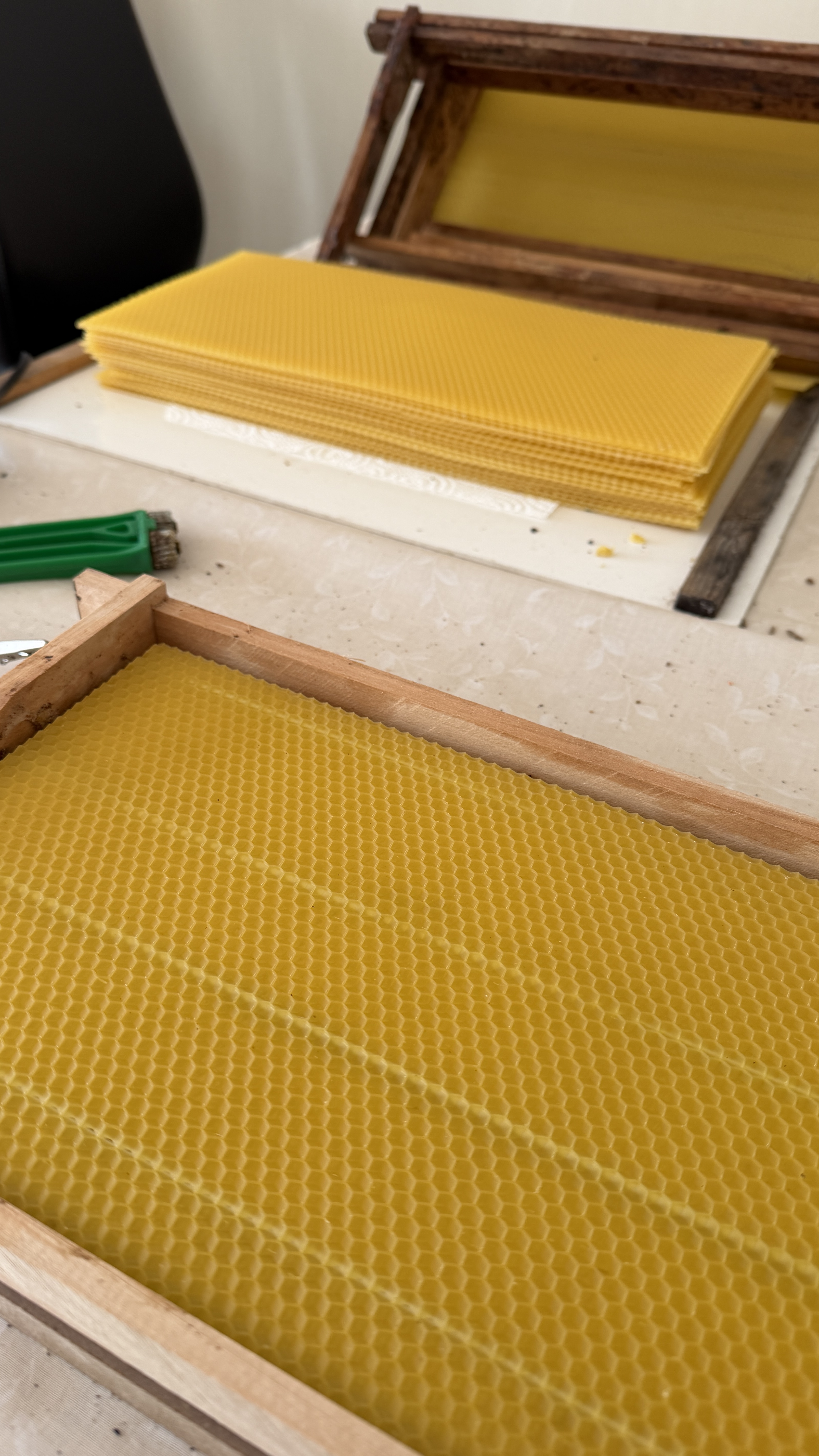 Bevor die erste große Nektarwelle einsetzt, bekommen die Honigrähmchen neue Mittelwände eingelötet. Diese feinen Wachsplatten geben den Bienen die perfekte Bauvorlage.