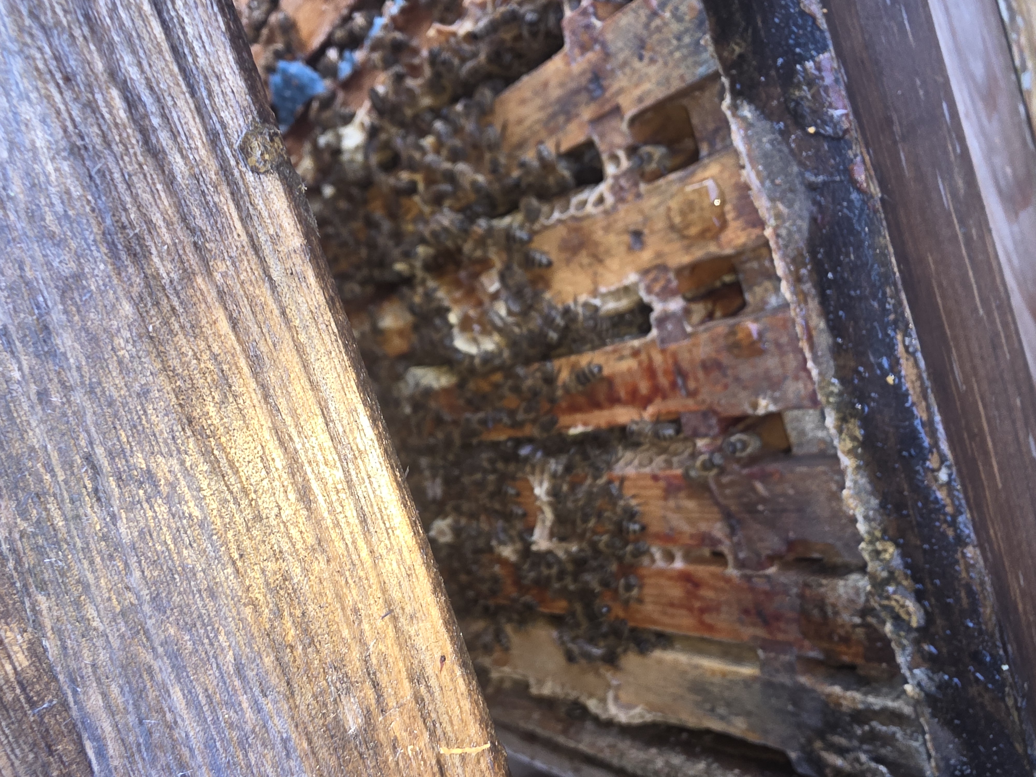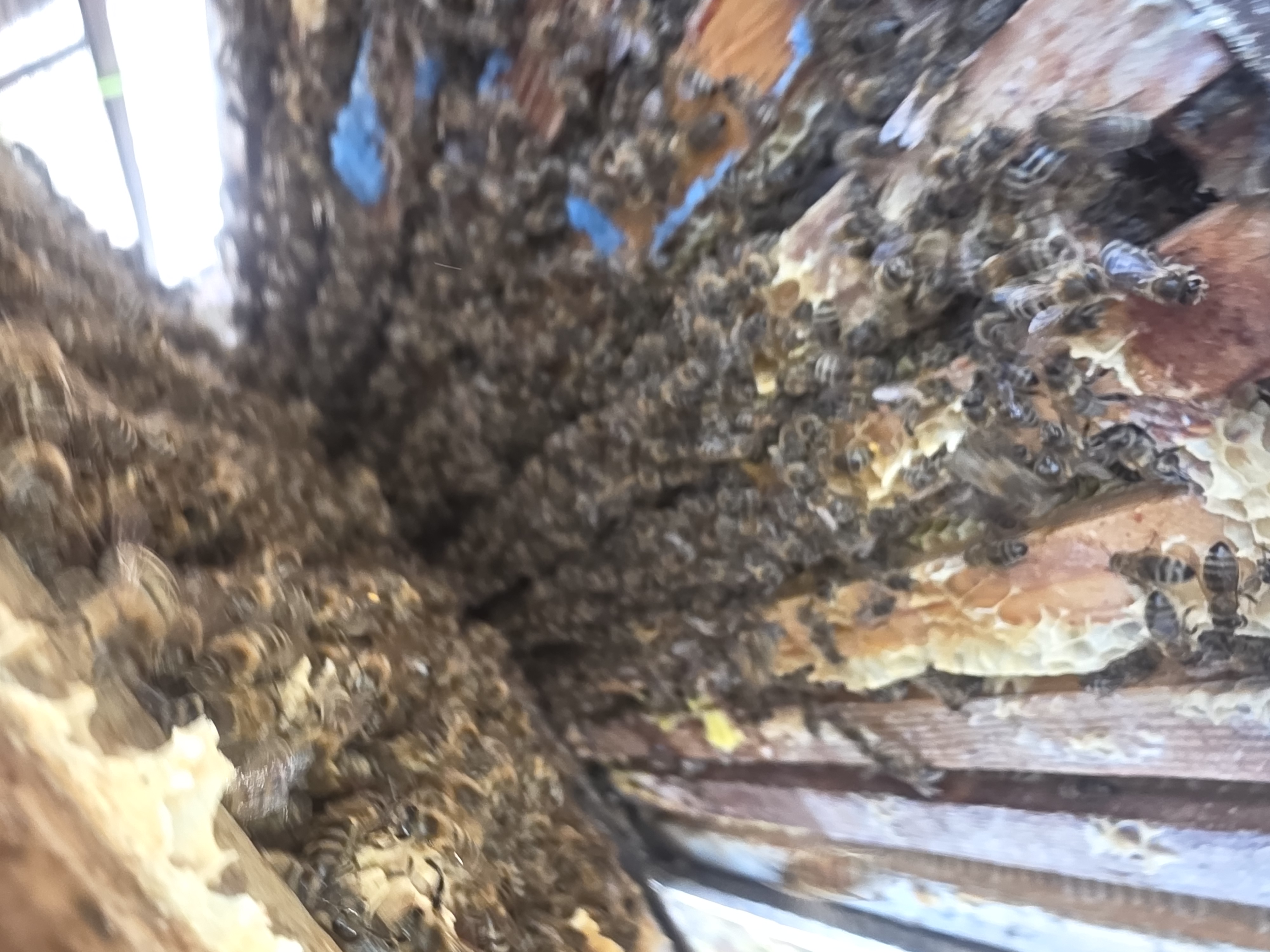 Kurze Futterkontrolle und schauen nach der Volksstärke. Futter ist ausreichend, Bienen sind am Brüten, Jungbienen schlüpfen, der Drohnenrahmen wird bestifftet. Das Frühjahr kann endlich kommen, den Busch-Bienen geht es hervorragend.