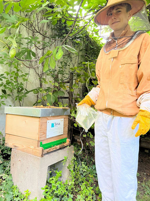 Nun haben wir den Honig in Gläser abgefüllt und die Gläser danach mit Etiketten beklebt. Leider war es noch nicht besonders viel Honig, aber wir haben das Volk ja auch erst seit ein paar Monaten. Später haben wir die Bienen mit Zuckerwasser gefüttert. Das Zuckerwasser ist in einem Beutel, und man macht ein paar Löcher hinein, damit die Bienen an das Wasser kommen.