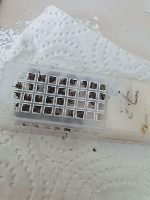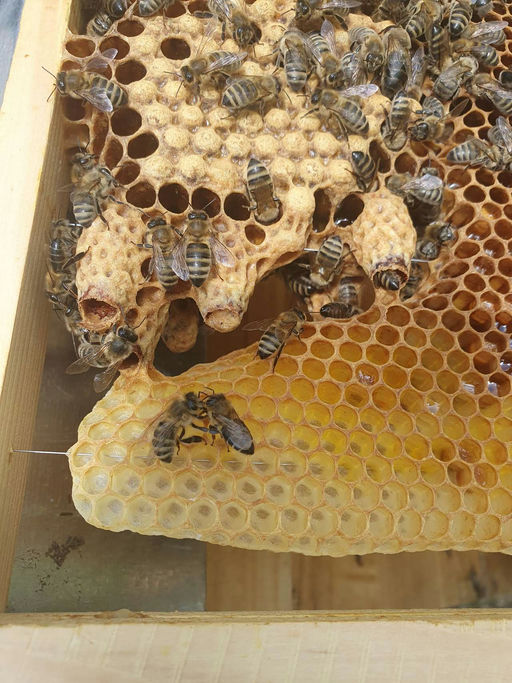 Ein Update: Nach der Varroabehandlung war eine der neuen Königinnen leider verstorben. Es handelte sich dabei um eines der neuen Völker (Ableger), welches sich aber wirklich gut entwickelt hatte. Nach dem Einhängen einer Eierwabe aus einem anderen Volk zeigte sich, dass die Bienen schnell eine neue Königin ziehen wollten. Logisch, es ist ja auch schon spät im Jahr. Wir haben uns dann entschieden, mit einer neuen Zuchtkönigin unter die "Flügel" zu greifen. Schließlich soll ja schnell eine stabile Population an Winterbienen aufgebaut werden. Ein Züchter aus unserem Verein hat mir dann eine Königin überlassen. Nach Entfernung aller angelegten Weiselzellen habe ich die neue Königin im Käfig eingehängt und konsequent 14 Tage in Ruhe gelassen. Nun kann ich verkünden, dass sie sehr gut angenommen wurde. Das Volk ist viel ruhiger und Brut ist auch gut vorhanden. Jetzt wird nur noch der Rest Winterfutter eingefüttert, regelmäßige Stichproben der Varroa durchgeführt, und dann bekommen die Bienen ihre wohlverdiente Pause.