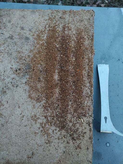 Im Winter lassen die Bienen immer ein paar "Brösel" fallen. Hauptsächlich sind das aufgenagte Wabendeckel, um an den Honig zu kommen, aber auch Varroa-Milben, die bei der Behandlung im Winter abgefallen sind, und anderer Abfall.