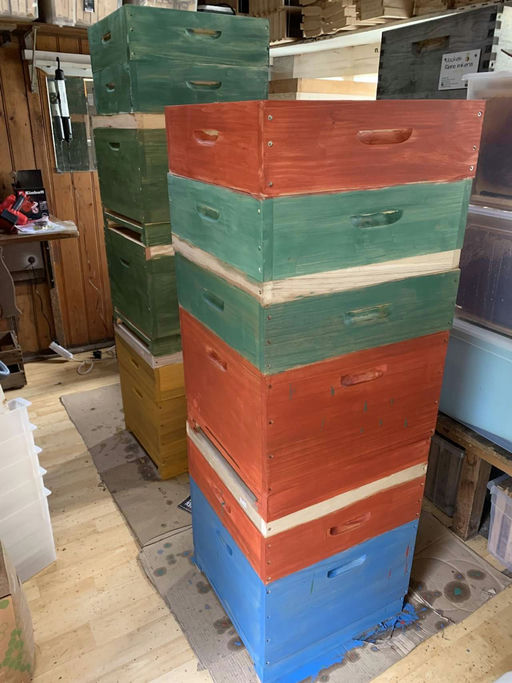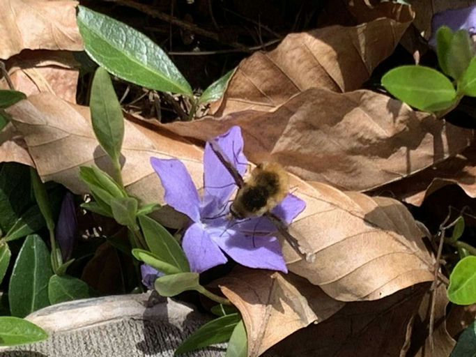 Die Beuten sind gestrichen, der erste Check im März ist gemacht. Jetzt stellt sich die spannende Frage, wann die Honigräume aufgesetzt werden. Bleibt es eher kalt, muss ich darauf achten, dass die Bienen noch genug Futter haben. Sobald es wärmer wird und spätestens, wenn die Kirsche anfängt zu blühen, müssen die Honigräume rauf. Das kleine pelzige Wollknäuel auf einem der Fotos ist übrigens keine Biene und auch keine Hummel, sondern der Große Wollschweber. Er gehört zur Familie der Fliegen, erkennbar daran, dass die Tierchen zwei Flügel und nicht vier wie die Bienen haben. Den Wollschweber habe ich beim Wandern entdeckt; er kommt noch häufig vor und fliegt auch bei Temperaturen unter 10 °C.