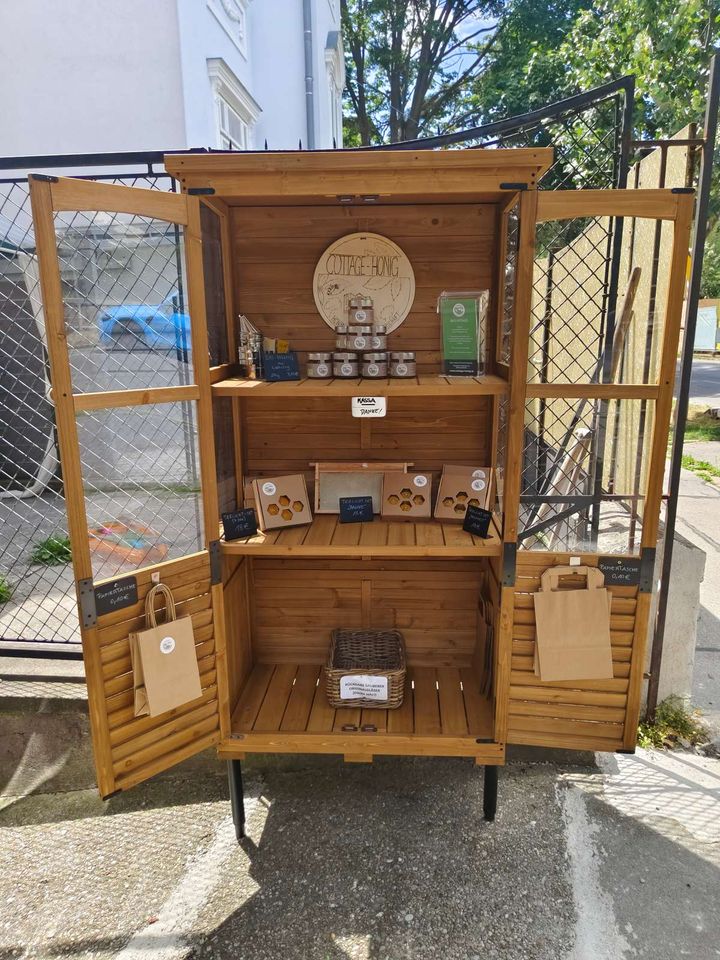 Der Aufbau war einfach und rasch erledigt. Nun steht die Vitrine vor der Garage, gut ersichtlich und frei zugänglich. Erhältlich sind Honig und Kerzen. Und bald auch wieder Gutscheine für meine beliebten Imker-Schnupperkurse.