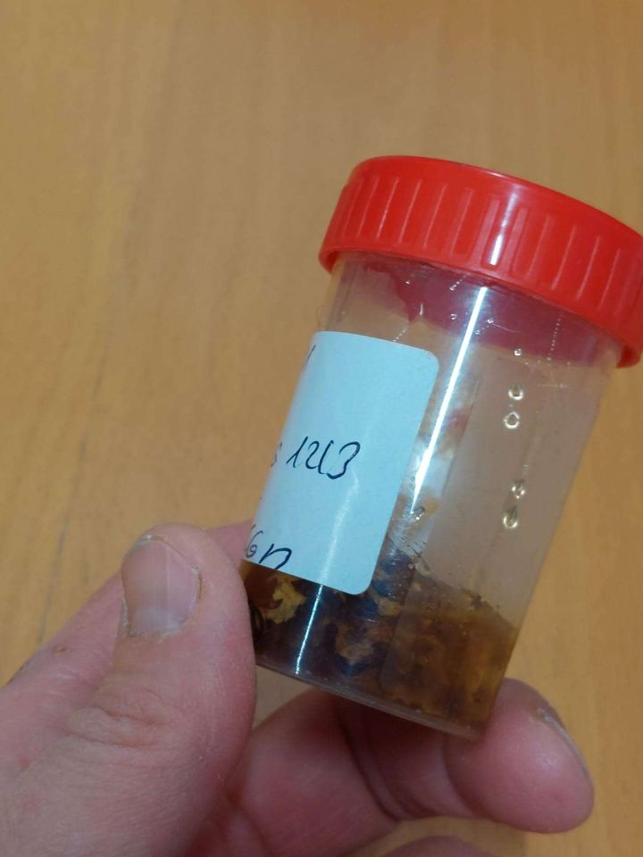 Für eine Futterkranzprobe werden 2-3 Esslöffel Futter aus dem Futterkranz, der sich unmittelbar über dem Brutnest befindet, entnommen und in einem Probenbecher gesammelt. (Siehe Fotos)