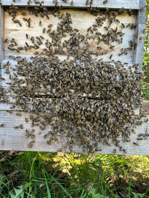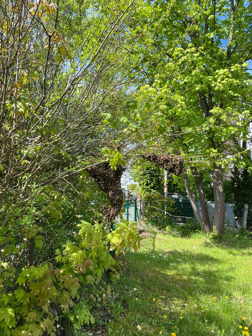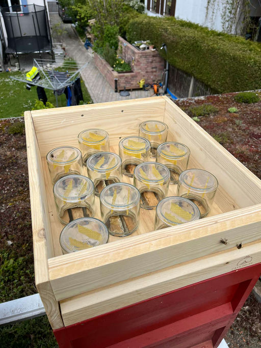 Nach dem Frühstart mit der Kirschblüte im März folgten nun zwei Wochen fast ohne Flugbedingungen für die Bienen. Dementsprechend groß war die Sorge vor allzu großem Schwarmtrieb bei den Völkern. Bei unserer heutigen Durchsicht konnten wir einen Schwarmabgang live erleben. Ansonsten haben sich unsere Sorgen zum Glück nicht bewahrheitet. Die kalte und nasse Zeit haben wir genutzt, um unseren neuen Standort etwas einzurichten – hier werden unsere neuen Bienen von "den Bayerischen" ihr neues Zuhause bekommen. Des Weiteren haben wir zum Testen eine Zarge gebaut, in welcher die Honiggläser direkt über dem Honigraum aufgestellt sind. Hier sollten die Bienen ihre Waben direkt in das Glas bauen... wir sind gespannt.