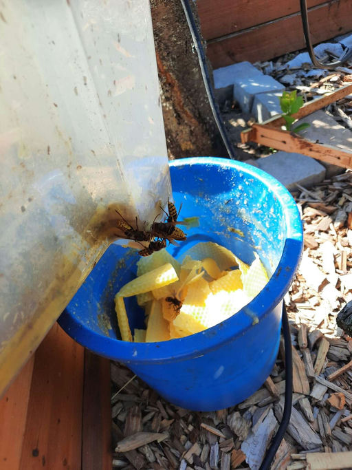 Wir versuchen, neben unseren Honigbienen auch anderen Insekten einen Lebensraum und Futter zu bieten. So pflanzen wir Blühwiesen für alle an und bieten anderen Insekten Nisthilfen. Es gibt aber auch Eindringlinge, die unser Ökosystem ganz schön durcheinanderbringen können. So breitet sich die Asiatische Hornisse immer weiter aus, auch in Hessen. Erste Sichtungen sind gar nicht so weit von Darmstadt entfernt. Ich hoffe, wir bleiben davon verschont. Da ich die Hornisse selbst (zum Glück) noch nicht gesehen habe, habe ich kein Bild. Dafür zeigt das Bild ganz gut, dass wir die "normale" Hornisse auch zuhauf haben. Ich habe euch noch ein zweites Bild von unserem Bienen-Dreh angehängt. Ich bin schon sehr auf das Ergebnis gespannt.