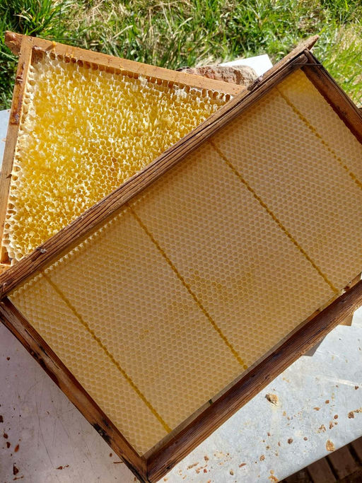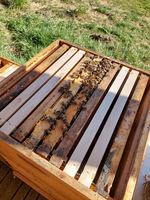 Auf beiden Seiten neben den Bruträhmchen hängen wir Jungfernwaben. Das sind bereits ausgebaute bzw. ausgeschleuderte Waben aus dem Vorjahr. Danach folgen jeweils zwei Rähmchen mit Mittelwänden und dann wieder eine Jungfernwabe. So kann das Futter gleich direkt neben der Brut eingelagert werden. Durch die Mittelwände beschäftigen wir die Bienen zusätzlich.