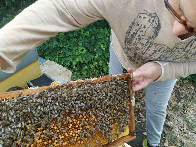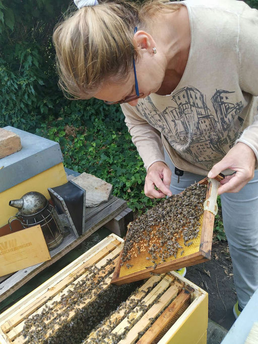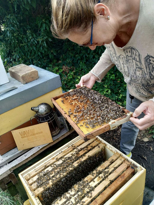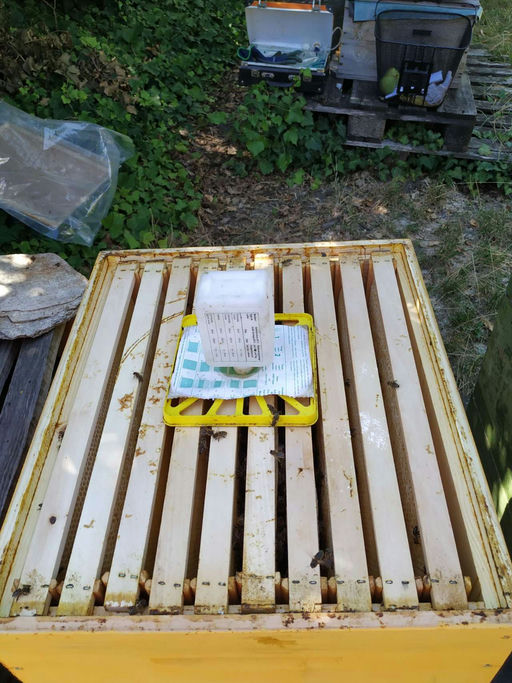 Das Volk hat sich im August mit jungen Bienen gestärkt und die Königin hat viel Brut angelegt. Eine zweite Ameisensäurebehandlung wurde gegen die Varroamilbe durchgeführt. Der Varroaabfall war nicht zu hoch und ich konnte auch auf den Bienen keine Varroa-Milben beobachten. Eine zweite Zarge wurde aufgesetzt und fleißig mit Zuckerwasser im Verhältnis 1:1 gefüttert, da im August nur wenig Nektar in den Blüten zum Eintragen vorhanden war. Auch die Bienen haben unter der enormen Hitze gelitten. Der ganze Monat war sehr trocken und heiß, daher konnte von den Bienen kaum Tracht eingetragen werden. Das Wichtigste war somit, das Volk zu behandeln und zu füttern, damit es als starkes Volk in den Herbst starten kann.