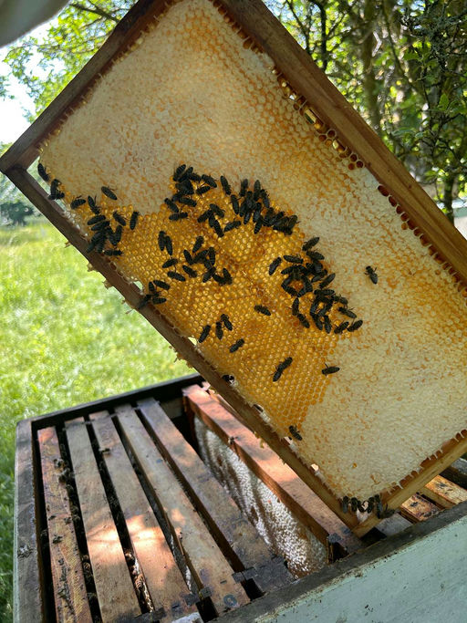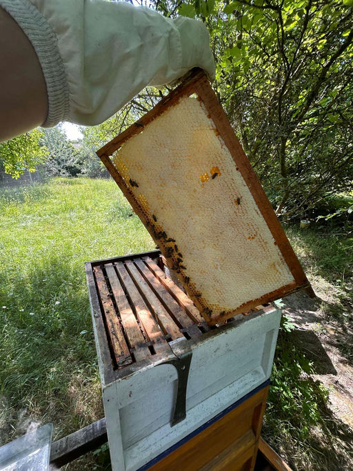 Aber die Vorfreude überwiegt, wenn man volle Waben "ziehen" kann und schon voll verdeckelten Honig vorfindet. Dann weiß man, die Zeit ist bald reif.