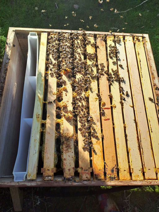 Die letzten Februartage und ersten Märztage brachten ideales Flugwetter. Daher habe ich mich dieses Jahr entschieden, die Völker bereits früh im März auszuwintern. Da ich das Beutenmaß Dadant verwende und somit im angepassten Brutraum imkere, werden die Völker im Frühjahr auf einige wenige Rähmchen mithilfe eines Schiedes eingeengt. Das restliche Futter habe ich nicht entnommen, sondern hinter das Schied gehängt. Lediglich die leere Futtertasche und gegebenenfalls schon leere Rähmchen werden entnommen. Die Völker sammeln derzeit schon fleißig Pollen. Nektar gibt es noch nicht ausreichend, daher benötigen die Völker noch das restliche Winterfutter.