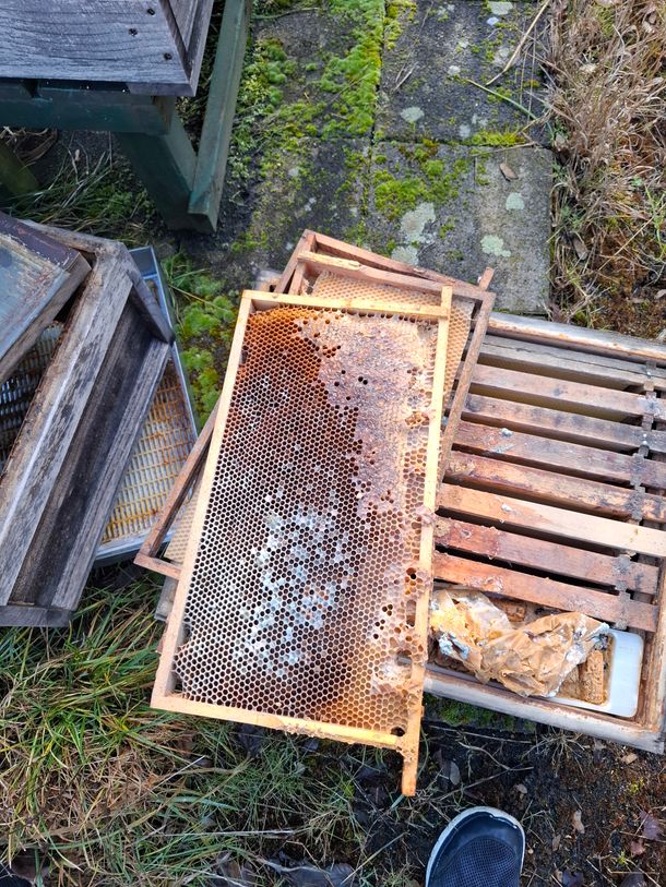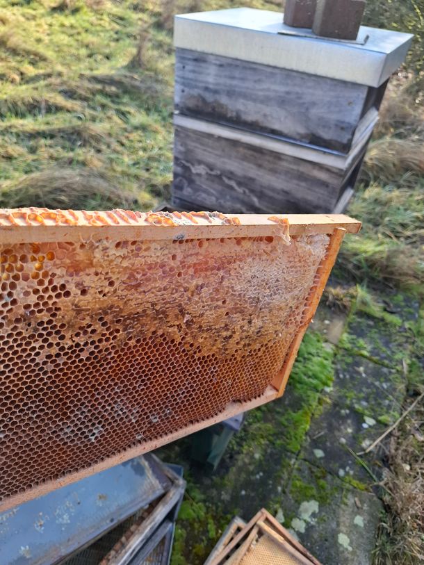 Auch ist es in der Natur ganz normal, dass ca. 10 bis 20 Prozent der Bienenvölker den Winter nicht überleben. Hier gilt es dann, die Ursache zu ermitteln. Leider war es auch so an diesem Standort. Es war noch genügend Futter vorhanden, siehe Futterwaben. Anzeichen von Krankheiten waren nicht erkennbar.