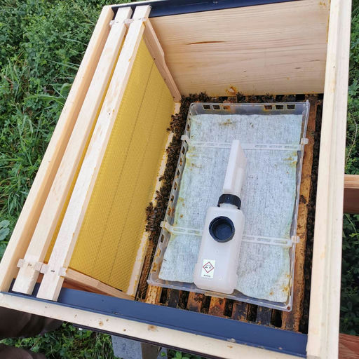 Dagegen müssen wir etwas tun. Zur Behandlung wird Ameisensäure verdunstet. Die Bienen können das ab, aber den Milben geht's an den Kragen.
