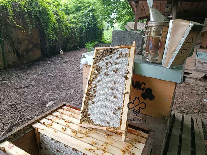 Zusätzlich zur Honigernte ist es wichtig, die Bienenvölker auf Schwarmtrieb zu überwachen. Schwärme entstehen, wenn ein Teil des Bienenvolks mit der alten Königin den Stock verlässt, um eine neue Kolonie zu gründen. Um dies zu verhindern, sollten Imker:innen regelmäßig die Bienenstöcke kontrollieren und gegebenenfalls Maßnahmen ergreifen, wie das Erweitern des Brutraums oder das Teilen von Völkern.
