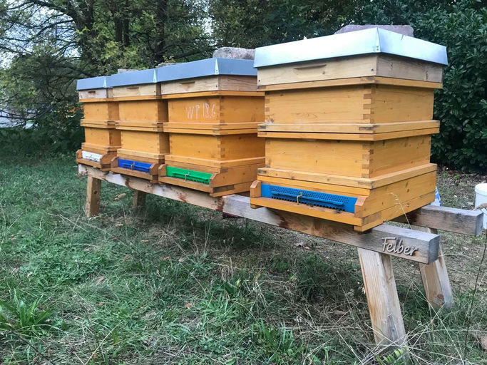 Wie im letzten Beitrag bereits erwähnt, geht es im Spätsommer und Herbst darum, zu schauen, dass es den Bienen gut geht, damit sie gut für den Winter vorbereitet sind. Die Bienen, die jetzt ausgebrütet werden, die sogenannten Winterbienen, müssen nicht mehr so viel arbeiten und sind dadurch langlebiger als die Sommerbienen. Während eine Sommerbiene eine Lebenserwartung von ca. 5-6 Wochen hat, leben die Winterbienen ca. 5-6 Monate. Im Winter werden auch kaum noch neue Bienen ausgebrütet, das Bienenvolk schrumpft von ca. 50.000 Bienen im Sommer auf eine Handvoll Bienen, die in einer Traube zusammengekuschelt den Winter überstehen. Deshalb brauchen die Bienen besonders jetzt unsere liebevolle Unterstützung, damit sie sich gut auf den Winter vorbereiten können. Wir füllen die Futterreserven weiterhin mit speziellem Bio-Bienenfutter auf, kontrollieren das Brutnest und schauen, ob alle Völker eine Königin und genügend Bienen haben und ob sie gesund sind. Ebenso behandeln wir die Bienen gegen die gefährliche Varroa-Milbe. Ein kleines Dankeschön dafür, dass sie uns den leckeren Honig im Sommer schenken.