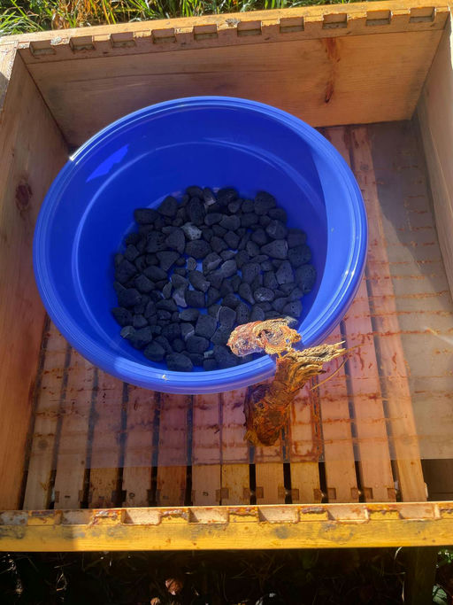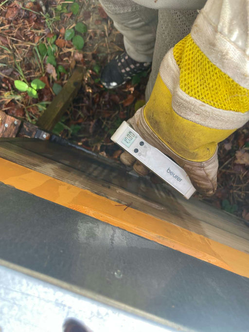 Im Oktober achte ich darauf, dass die Völker genug Futter für den Winter haben. Dafür wiege ich die Völker mit einer Kofferwaage. Ich wiege jeweils hinten und vorne und addiere das Gewicht. So erhalte ich das Gesamtgewicht der Beute. Je nach Gewicht wird dann noch nachgefüttert. Den Futtersirup gieße ich in Schalen, die oberhalb der Bienen in der Beute in einer Leerzarge stehen. So können die Bienen, auch wenn es draußen zu kalt ist oder es regnet, das Futter in der eigenen Beute aufnehmen und in ihren Waben einlagern.