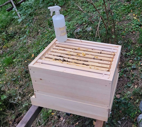Die Bienenbehausung habe ich bereits früher bekommen und auf einen eigens gebauten Stand gestellt. Bevor ich die einzelnen Rahmen in die Beute gehängt habe, sind die Bienen durch einige Sprühstöße Milchsäure noch einmal gegen Varroa behandelt worden. Links und rechts der besetzten Waben habe ich noch neue Rähmchen mit Mittelwänden eingehängt.