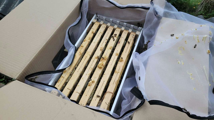 Der von der Erlebnissennerei Zillertal gesponserte Wabenableger auf insgesamt sechs Waben ist bei mir angekommen, in einer sehr ausgeklügelten Verpackung aus Karton und Netz. Vielen Dank.