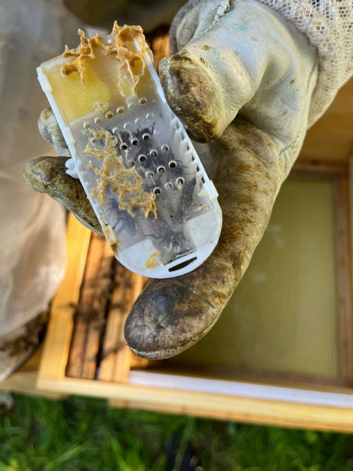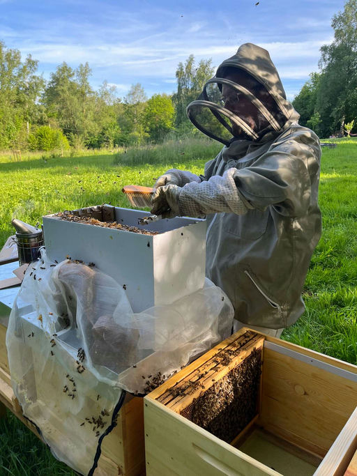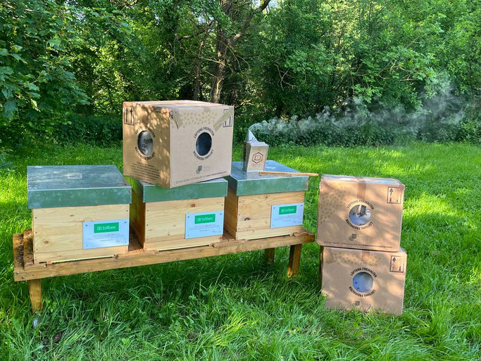 Gestern, also eigentlich noch im Mai, kamen unsere drei Billbee-Bienenvölker an. Heute durften sie in ihr neues Zuhause einziehen. Neugierig haben wir die Kartons geöffnet. Nicht nur für die Bienen waren die Versandkartons neu. Vorsichtig und mit viel Ruhe haben wir die Waben in die Beuten gehängt und die Königin zugesetzt. Es war viel Gefliege, aber die Bienen waren sehr friedlich, und nach fünf Minuten hatten sie sich schon merklich beruhigt.