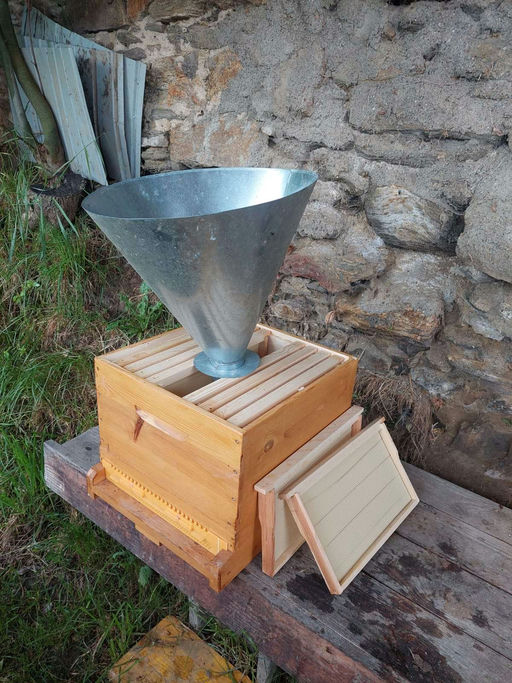 Auch unsere Bienen haben sich auf einem kleinen Apfelbaum unweit des Bienenstandes niedergelassen. Um sie einzufangen, habe ich sie zuerst mit Wasser besprüht und dann in einen großen Kübel geschüttelt. Von dort aus habe ich sie direkt in den vorbereiteten Bienenstock gegeben. Um das Volk beim Ausbau der Mittelwände zu unterstützen, habe ich sie mit Zuckerwasser, versetzt mit Salbeitee, gefüttert.