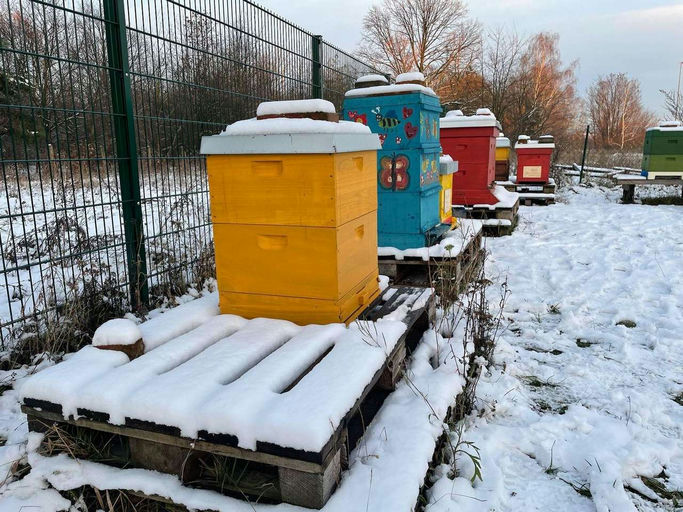 Bei wechselndem Wetter im Winter wird den Bienen einiges abverlangt. Um den Jahreswechsel konnten bei warmen 15 Grad und Sonne einige Bienen vor den Fluglöchern gesehen werden. Der kältere Januar hingegen brachte Schnee und eisige Temperaturen an den Bienenstand. Das routinemäßige Nachwiegen der Völker zeigt, dass alle Kolonien bereits brüten. Wir sind gespannt, wie die Bienen den Winter überstehen.