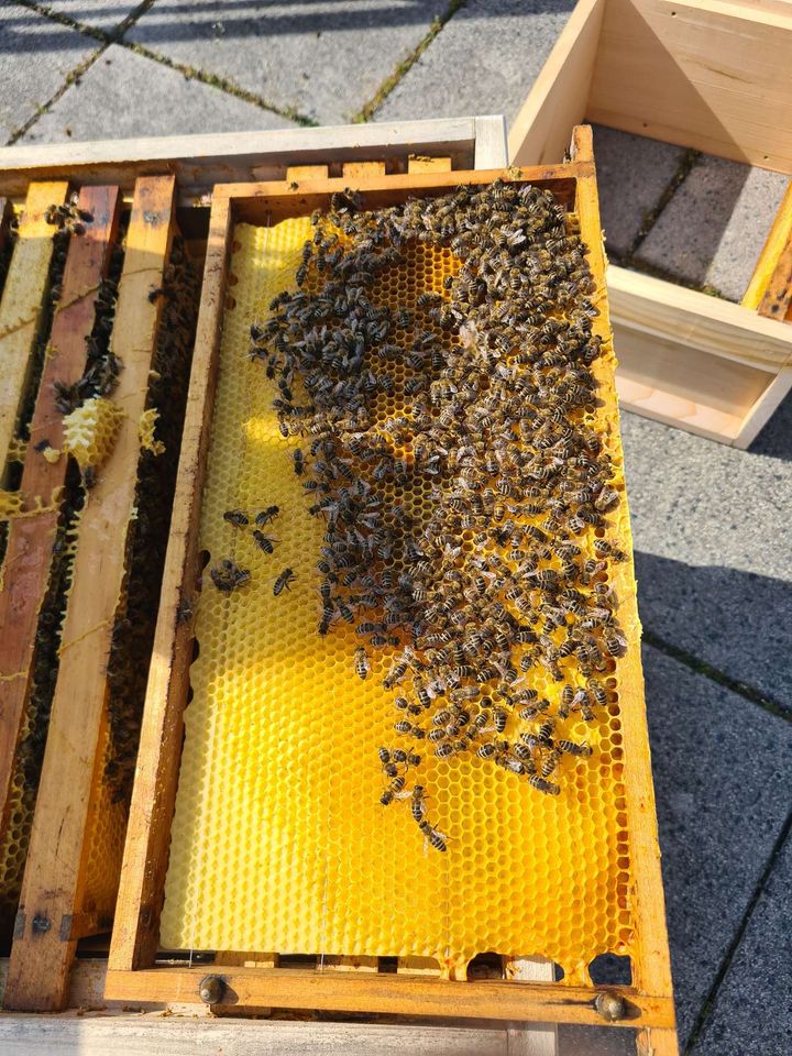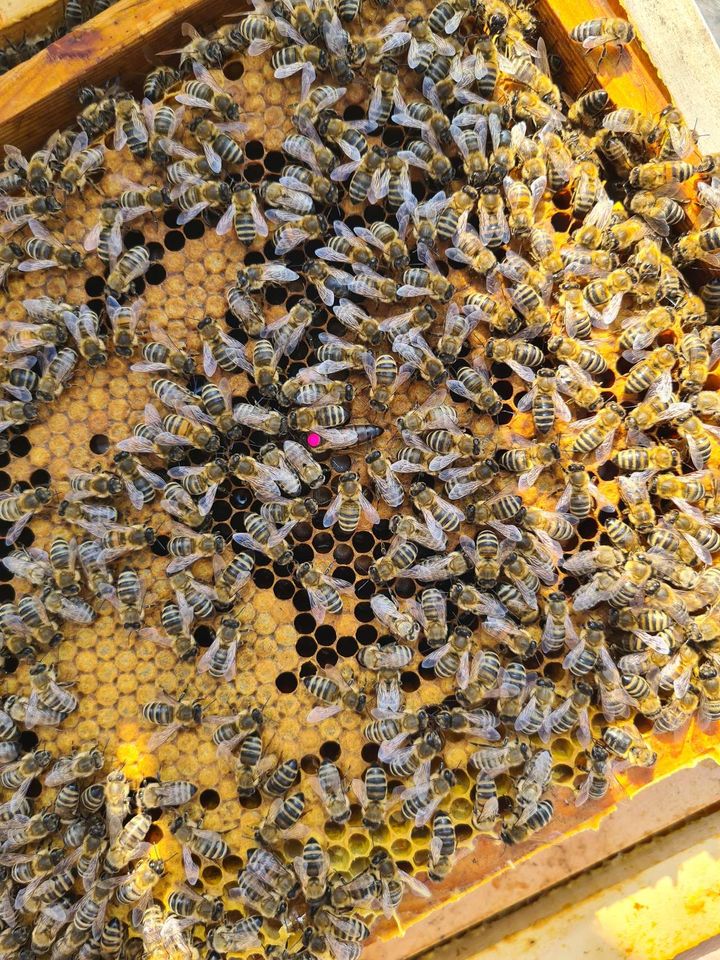 durch die warme Witterung sind die Völker für März schon ziemlich weit entwickelt. Die Bienen tragen Pollen und Nektar ein. Die Königin ist sehr aktiv und legt bereits große Brutflächen an. Wir haben mittlerweile die einzelnen Stöcke erweitert bzw. bereits eine zweite Beute mit neuen Rähmchen aufgesetzt. Einige Königinnen wurden markiert. Bei manchen Völkern ist bereits ein kleiner Honigvorrat vorhanden.