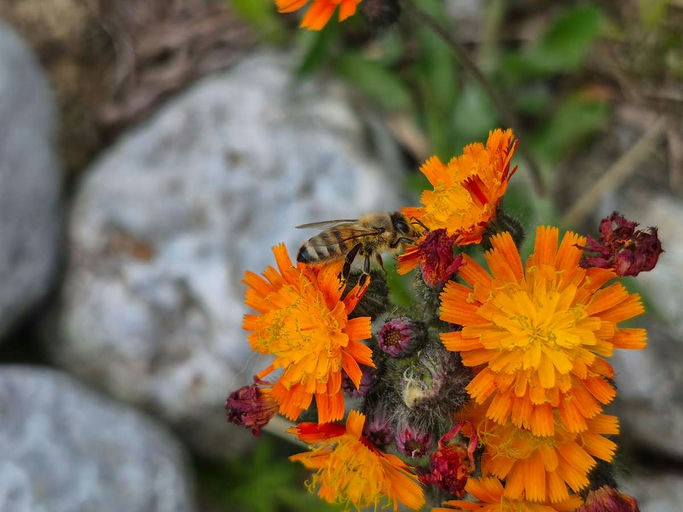 Bienen benötigen mehr als nur Blüten: Artenreiche Bienenwiesen liefern Nektar und Pollen als Nahrung – ideal sind heimische Wildblumen, die vom Frühling bis in den Herbst blühen. Genauso wichtig sind Wasserquellen! Bienen trinken nicht nur, sie benötigen Wasser zum Kühlen des Stocks und zur Fütterung der Brut.