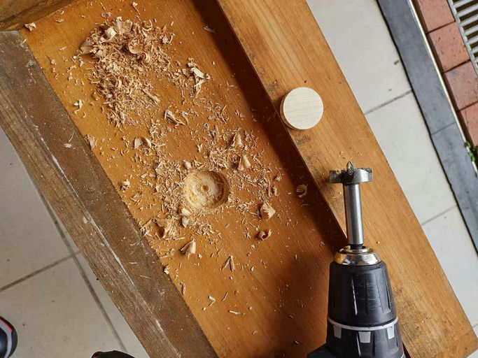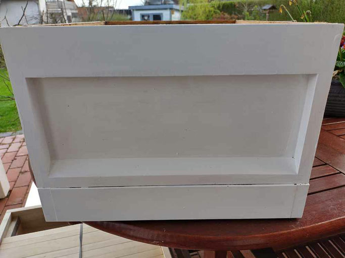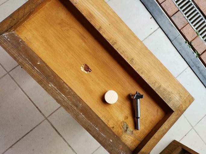 Nebenbei hatte ich noch drei Kisten mit einem Spechtloch zu flicken. Das geht ganz gut mit einem Forstnerbohrer, Leim und ein paar passenden Holzstopfen. Danach noch abschleifen und mit einer auffälligen Farbe streichen - in der Hoffnung, dass der Specht keine Lust auf bunte Beuten hat.