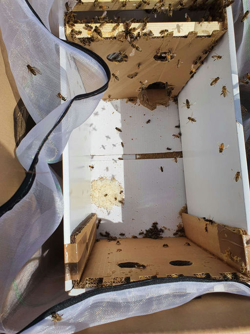 Nach telefonischer Ankündigung wurden nun unsere Projektbienen bei uns angeliefert. Natürlich war schon alles vorbereitet, und ich konnte den Karton vorsichtig öffnen, um die darin befindlichen Bienen behutsam in ihre neue Behausung umzuhängen. Die Königin war separat in einem kleinen Königinnenkäfig, den ich gleich zwischen die Bienen gehängt habe. Nun müssen die Bienen nur noch den Verschluss aus Zuckerteig am Königinnenkäfig freifressen, und das Bienenvolk ist komplett. Für einen guten Start gibt es jetzt erst einmal eine Portion Zuckerwasser. Dafür habe ich den Fütterer gleich auf die Beute gestellt. Die Bienen haben sicher nach so einer Reise Hunger.