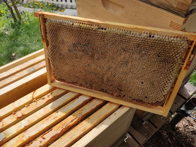 Leider ist es dieses Jahr bereits zu spät, um ein Bienenvolk artgerecht umzusiedeln und entsprechend einzuwintern. Deshalb habe ich mit dem Imker, der mir das Bienenvolk erstellen wird, vereinbart, dass ich das Bienenvolk im Frühling übernehmen werde. Um euch die Zeit bis dahin ein wenig zu verkürzen, gebe ich euch ein paar Einblicke in die Einfütterung meiner anderen Völker. Jedes Volk erhält für den Winter ausreichend Futtersirup oder Futterteig (Invertzucker), damit die Völker genug zu essen haben für den hier in Österreich manchmal langen Winter. So sieht übrigens eine volle Honig- bzw. Futterwabe aus: