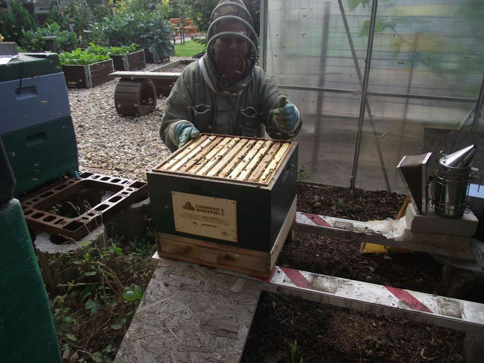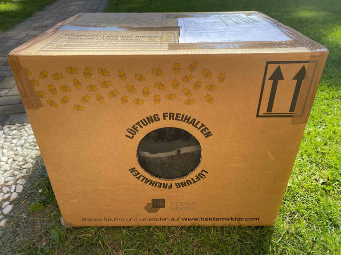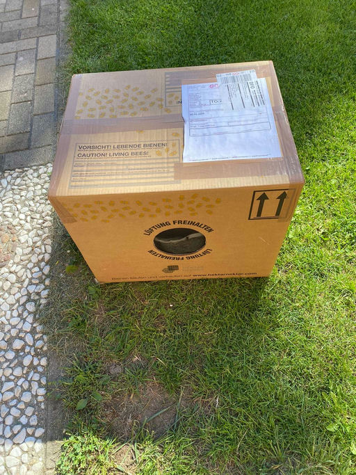 Nachdem die Beute vorbereitet ist und an ihrem Platz steht, wird das neue Völkchen nun eingesetzt. Die Bienen haben den Transport gut überstanden, und nach einer kleinen Erholungspause kann ich den Ableger umsetzen. Der Smoker, der Stockmeißel und der Abkehrbesen sind bereit. Die Transportkiste wird nun geöffnet, und jedes einzelne Rähmchen wird in der Beute platziert. An den Rand kommen Futterrähmchen, damit die Bienen genügend Futter für die Überwinterung haben. Die Königin im Zusetzkäfig wird in die Wabengasse gehängt. Wenn alles klappt und die Königin gut angenommen wird, kann ich in ein bis zwei Wochen ins Volk schauen, um zu sehen, ob frische Stifte vorhanden sind. Dies ist dann ein gutes Zeichen dafür, dass die Königin im Volk ist, und ich kann das Volk in Ruhe lassen.