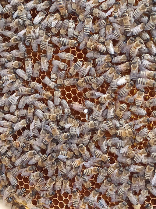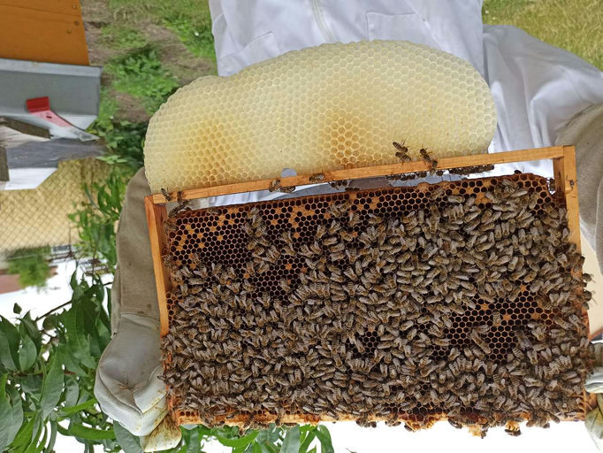 Das Volk von Hektar Nektar hat sich sehr gut entwickelt. Wir imkern im Brutraum auf DNM 1,5, das Volk wurde auf kleineren DNM-Rähmchen geliefert. Somit hatten die Bienen einiges zu tun, denn sie mussten die DNM 1,5-Mittelwände neu ausbauen. Wir haben große Mittelwände zwischen die kleineren Brutwaben gehängt. Am Anfang taten sich die Bienen etwas schwer und haben die Mittelwände nicht bis unten ausgebaut. Mittlerweile sind die Mittelwände ausgebaut und die Königin legt fleißig ihre Eier in die neu ausgebauten Waben. Auf einem Foto ist erkennbar, dass die Bienen die DNM-Rahmen nach unten "verlängert" haben. Wespen sind am Flugloch zu sehen, das Volk sollte aber stark genug sein, sich zu verteidigen. Vielen Dank an das Team von Hektar Nektar und Sirius Facilities GmbH.