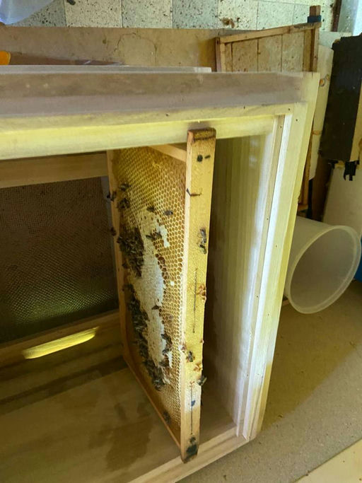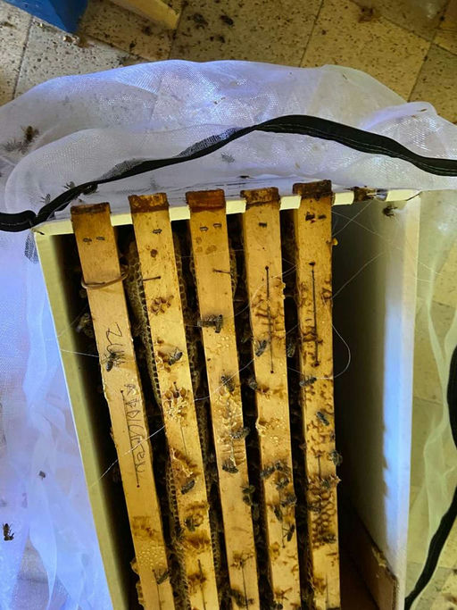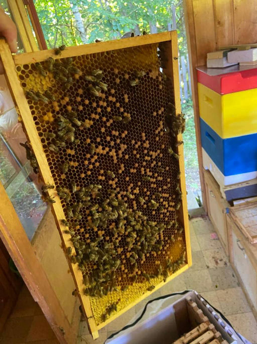 Das Volk ist mit dem Paketdienst eingetroffen. Meine Mutter hat es entgegengenommen, da ich zu dieser Zeit bei der Arbeit war. Das Paket mit den Bienen wurde dann gleich in den kühlen Keller gestellt und mit einer Sprühflasche mit Wasser befeuchtet. Am nächsten Tag wurden die Bienen in ihr neues Zuhause gebracht. Die Waben wurden von der Kiste in die Beute gehängt, und ein paar Futterwaben wurden hinzugefügt. Da das Volk noch sehr klein war, habe ich den Bienen aus Angst vor Räuberei kein Zuckerwasser gegeben und das Flugloch verengt.