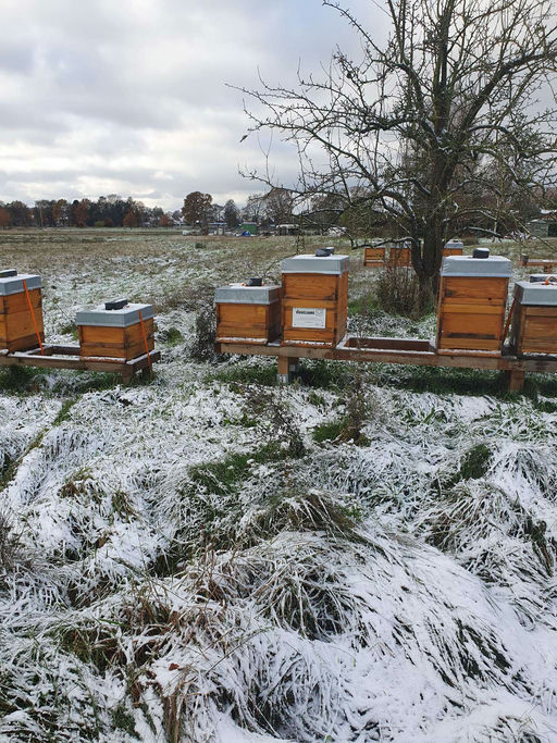 Im November gab es die ersten Fröste. 21 Tage nach dem ersten richtigen Frost sind alle Bienenvölker brutfrei und können ein letztes Mal im Jahr gegen die Varroamilbe behandelt werden. Für die Weihnachtsmärkte haben wir auch noch mehr Honig abgefüllt. In der Erkältungszeit kauft sich der ein oder andere ein Gläschen Honig beim Imker.
