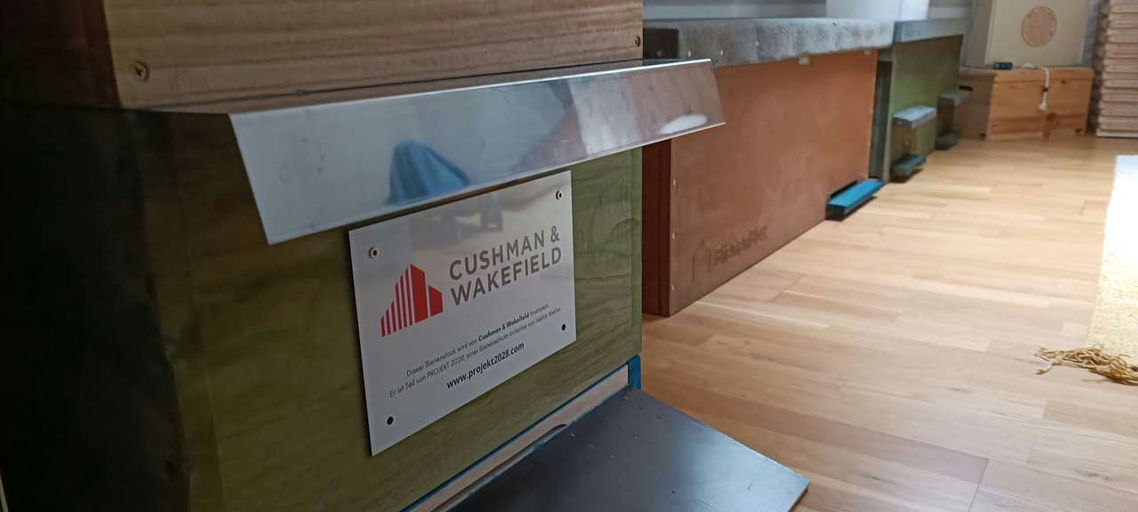 Als Imker:in hat man allerhand Zubehör. Mit jeder neuen Beute und jedem Volk kommen weitere Teile hinzu. Entsprechend braucht man Platz. Aktuell befindet sich dieser Platz in unserem Schlafzimmer – aber natürlich nur vorübergehend. Die neuen Beuten, darunter auch die durch HektarNektar und Cushman & Wakefield geförderte, warten darauf, zu ihrem Standplatz umziehen zu dürfen. In der Zwischenzeit habe ich die Dadant-Beute ein bisschen aufgehübscht: Sie hat ein Anflugbrett erhalten und ein kleines Fluglochdach, um die Bienen zu schützen. Und das Schild von Cushman & Wakefield macht sich auch gut.
