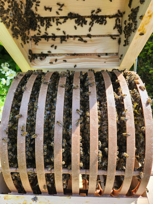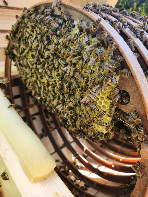 Unser neues Hektor-Nektar-Bienenvolk ist eingezogen. In ihrer neuen Beute scheinen sie sich sehr wohlzufühlen. Sie haben schon fleißig Waben gebaut.