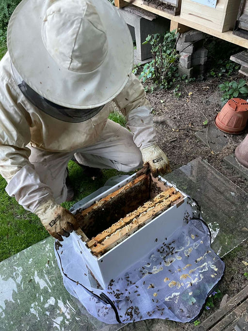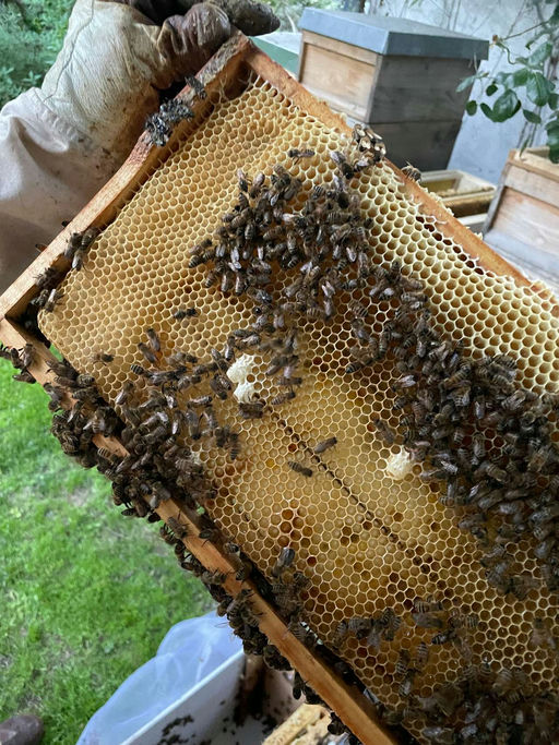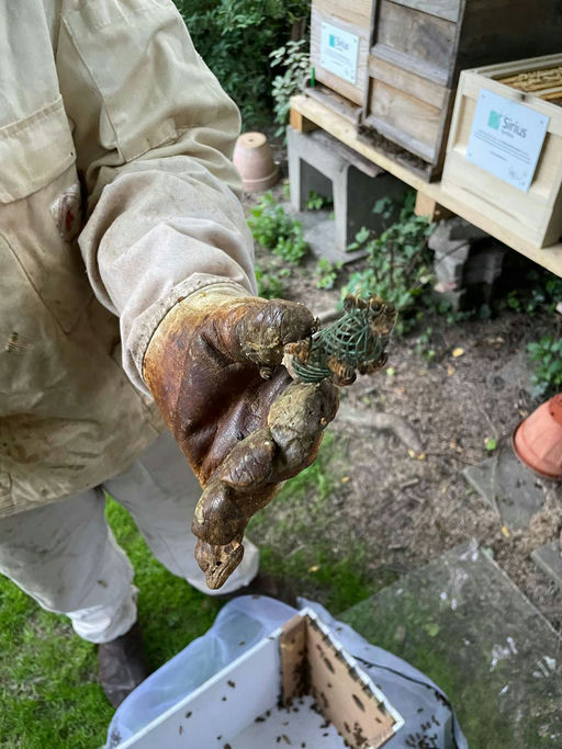 Am 14. Mai war endlich der Tag gekommen. Wir hatten die Beute bereits vorbereitet und konnten nach einer Ruhepause die Bienen in ihr neues Zuhause einsetzen. Das hat alles sehr gut geklappt. Die Königin war in einem kleinen extra Behälter, sodass wir sie vorsichtig am Ende zu ihrem Volk geben konnten. Jetzt dürfen sie sich eingewöhnen, und wir schauen erst nach einiger Zeit nach, wie es ihnen geht.