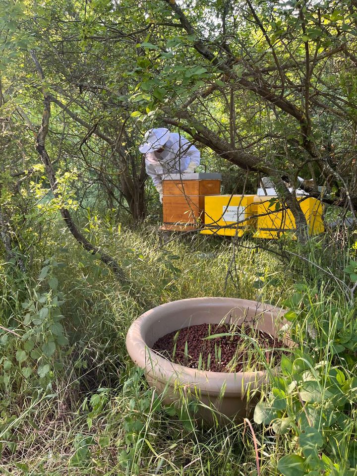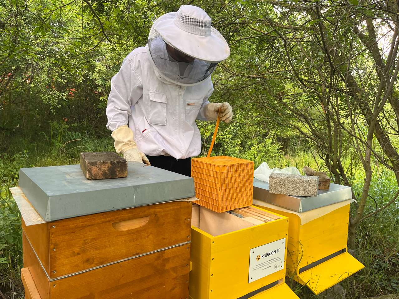Die gelieferte Kiste wurde am Bienenstand in die Dadant-Blatt 12 Beute gestellt, die bereits mit drei Rähmchen (nur Mittelwände) und einer Futtertasche gefüllt mit 9 l 1:1 Flüssigfutter (Zucker-Wasser-Mischung) bestückt war. Das Flugloch wird aufgrund der Flüssigfutterzugabe verkleinert, damit das neue Volk nicht sofort von den bereits bestehenden Völkern geräubert wird. Der Zusetzkäfig wurde entnommen und mittels Zahnstocher zwischen zwei Rähmchen gehängt. Der Käfig wurde geöffnet, damit die Begleitbienen im Käfig bzw. die Bienen außerhalb des Käfigs die Königin selbständig befreien können (der Käfig ist mittels Futterteig verschlossen, der von den Bienen leicht aufgegessen werden kann). Da sich die Königin nun nicht mehr in der Schwarmkiste befindet (sondern in der Beute), wandern die restlichen Bienen aus der Kiste und folgen der Königin. Dies ist die schonendste Methode, die neuen Bienen in die Beute einziehen zu lassen (bei anderen Beutemaßen kann mit zusätzlichen Zargen gearbeitet werden). Die Beute wurde geschlossen, und ein paar Tage später wurden die leere Schwarmkiste und der Zusetzkäfig aus der Beute entnommen. Nun muss abgewartet werden, bis die Rubicon IT Bienen die Mittelwände ausgebaut haben, die Königin in Eiablage geht und das Volk sich für das restliche Jahr vorbereitet.