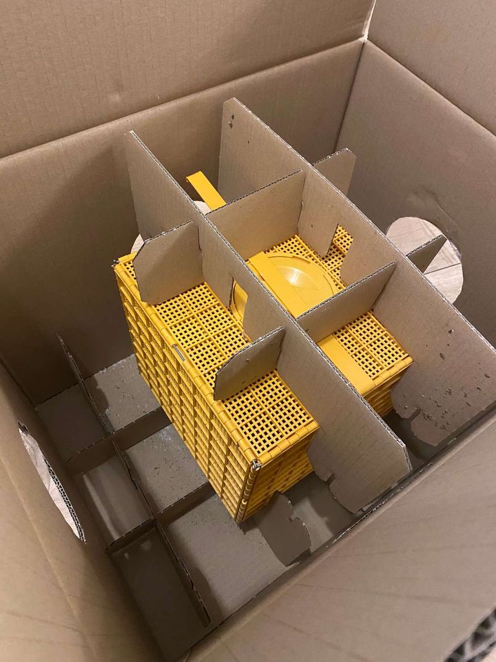 nun war es endlich soweit, und die Rubicon IT Bienen konnten in ihr neues Zuhause einziehen. Die Bienen, samt Königin, wurden als Kunstschwarm von Dirk Kroner (danke an @PirateBee) zur Verfügung gestellt. Ein Kunstschwarm wird meist wie folgt gebildet: Es werden Bienen von bestehenden Völkern in einen Behälter abgefegt (Achtung: Die Königin darf nicht mit abgefegt werden!) und je nach Wunsch mit Oxalsäure oder ähnlichen Mitteln gegen die Varroamilbe behandelt. Dadurch kann angenommen werden, dass der gebildete Kunstschwarm weitestgehend varroafrei ist. Für die weitere Bildung des Schwarms werden ca. 1,5 kg Bienen in eine Schwarmkiste (siehe Bild, orange Kiste) gefüllt, eine Königin in einen Zusetzkäfig dazu gehängt, und je nach Versanddauer kann ebenfalls noch Flüssigfutter hinzugefügt werden.
