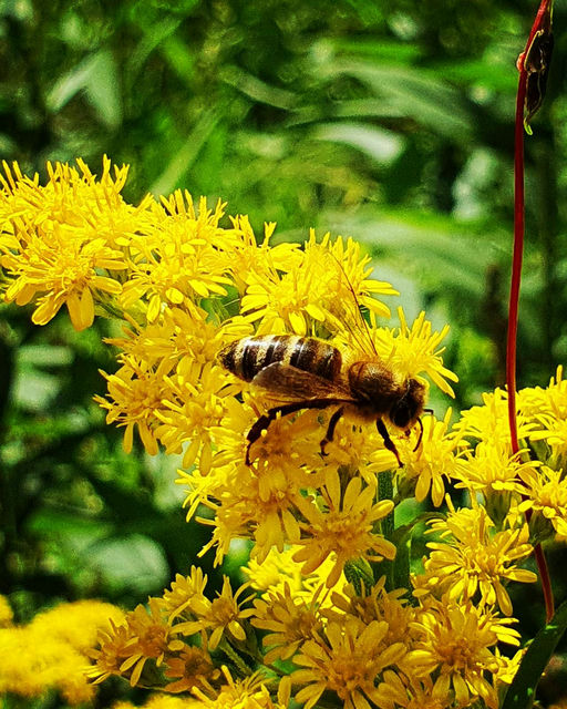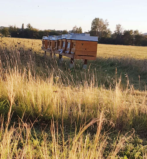 Der September ist nach dem verregneten Sommer recht warm. Bei meiner Kontrolle musste ich feststellen, dass die erste Varroabehandlung nicht ausreichend war. Das heißt, ich muss auf kühlere Tage warten und die Bienen noch einmal behandeln. Die Bienenvölker sind so gut wie aufgefüttert. An den heißen Tagen hängen sich die Bienen gerne vor die Beute, um das schöne Wetter zu genießen. Es blüht die Goldrute, dort holen die Bienen noch Pollen und Nektar.