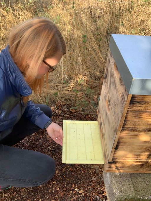 Ich kontrolliere in regelmäßigen Abständen die Varroalast meiner Völker, natürlich auch die meines Weinvolks von Langguth Erben. Das Volk steht gut da, es ist momentan nur Gemüll auf der Windel und keine Varroa zu finden. Was ist das Gemüll? Das Gemüll sind die Abfälle, die die Bienen beim Öffnen der Brutzellen oder Honigzellen produzieren. Dazu kommen auch schon mal Körperteile von Bienen, Wachs oder auch herabgefallener Pollen. Die Windel, auch Varroaschieber genannt, dient zur Kontrolle des Varroa-Befalls. So kann ich als Imkerin feststellen, ob ich eingreifen muss, damit das Volk gut durch den Winter kommt.