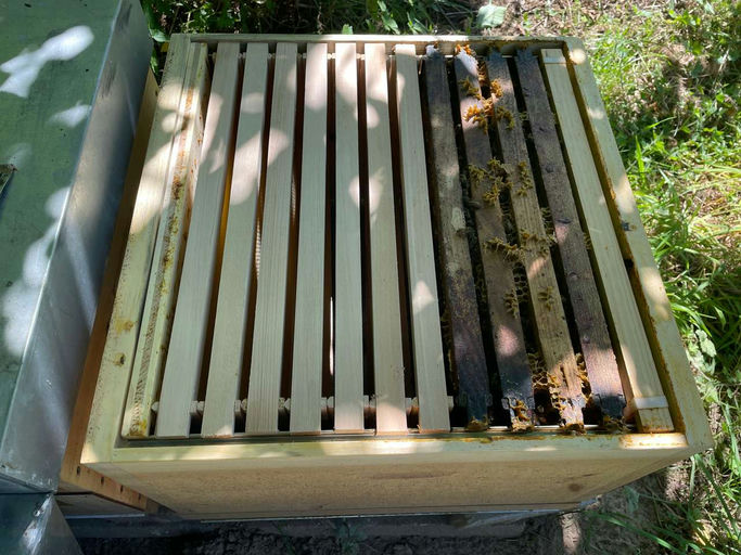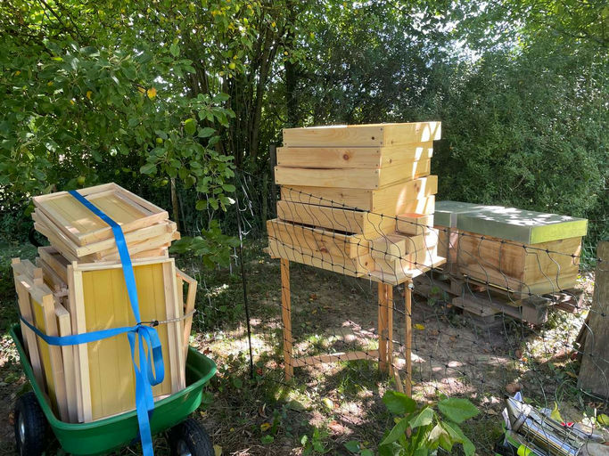 Nach der letzten Honigernte Mitte Juli ist an meinen Standorten nicht mehr mit nennenswertem Nektareintrag zu rechnen. Also müssen die Bienen gefüttert werden, damit sie fleißig weiter brüten und die Winterbienen zahlreich und kräftig werden. Um genügend Platz für die Wintervorräte zu haben, bekommen die Völker weitere Rähmchen eingehängt. Vorsichtshalber wird der ganze Brutraum voll gemacht, überzählige Rähmchen werden dann vor dem Winter wieder entnommen. Da kommt bei sieben Dadantvölkern eine ganze Menge Material zusammen. Gefüttert wird mit Zuckerwasser – anfangs eher dünn, um den Bautrieb zu fördern, später konzentrierter, damit die Bienen mit dem „Eindicken" nicht so viel Arbeit haben. Am Ende soll jedes Volk etwa 20 kg Vorräte mit in den Winter nehmen, um gut durch den Winter zu kommen.