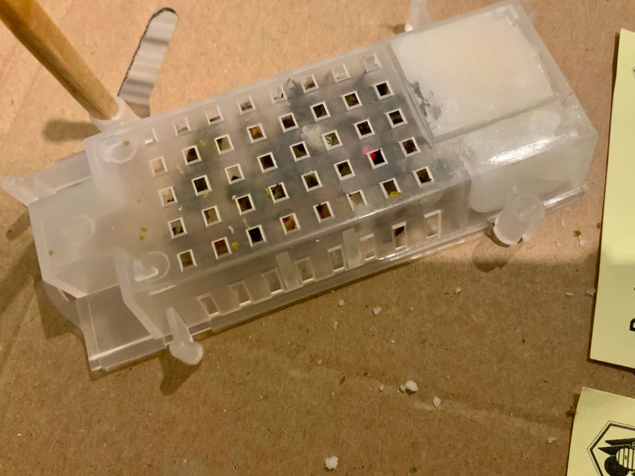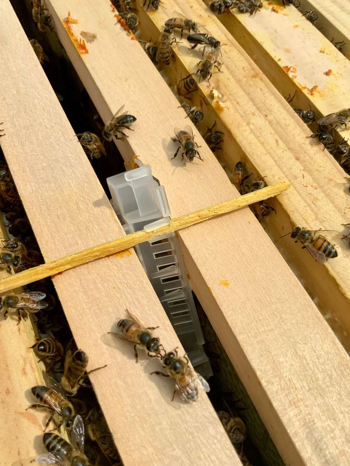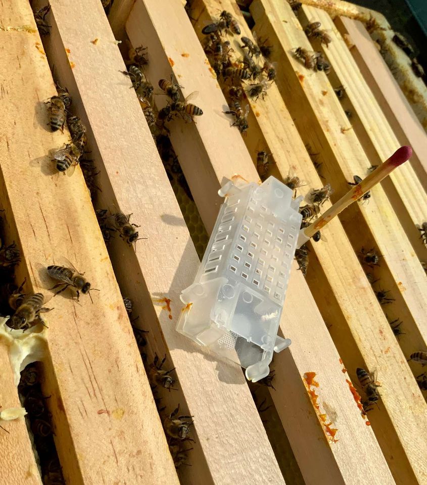 Auch gehört es im September dazu, schwächere Völker zu vereinen und zu kontrollieren, ob ausreichend Brut vorhanden ist. Ich hatte dabei leider ein weiselloses Volk vorgefunden. Hier hieß es dann schnell handeln. Gesagt, getan, indem ich noch eine Königin bestellen konnte, die mir dann per Post zugesandt wurde. Die Königin sitzt mit Begleitbienen in einem sogenannten Ausfresskäfig aus Kunststoff. Unten am Boden ist ein Futterteig angebracht, durch den sich die Bienen und die Königin freifressen können, sobald die Schutzklappe entfernt wurde. Ich setze diesen Käfig zwischen zwei Brutwaben und benutze ein Streichholz als Halterung.