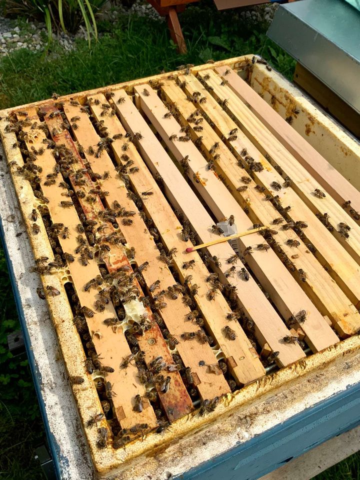 Ab jetzt wird für mindestens fünf bis sieben Tage nicht ins Volk geschaut. Da das Volk hoffnungslos weisellos war, wurde die Königin gleich angenommen, was mein Imkerherz natürlich sehr gefreut hat. Es ist nicht selbstverständlich, dass dies immer funktioniert. Wiederum nach ein paar Tagen waren die ersten Stifte von ihr gelegt worden. Somit fühlt sie sich wohl und das Volk ist gerettet.