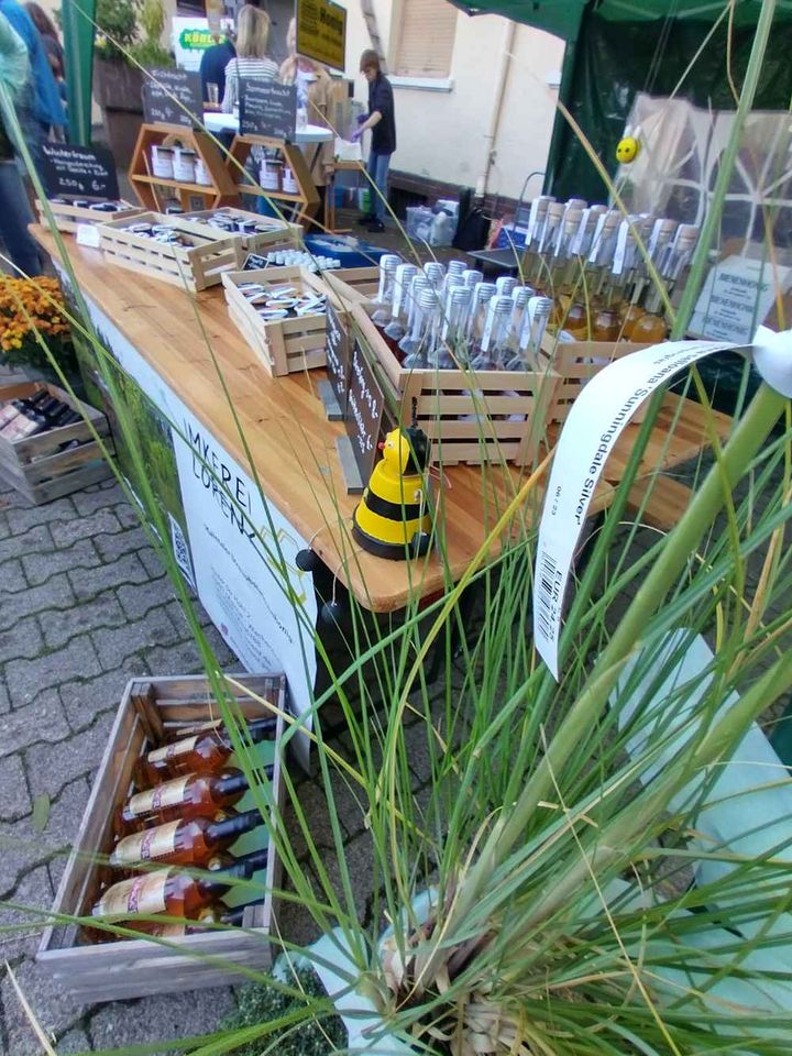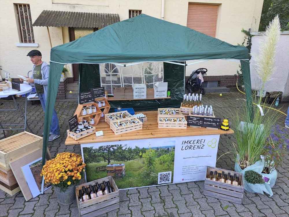 Der Herbst glänzt in diesem Jahr mit ungewöhnlichen Temperaturen. Mitte Oktober ist noch T-Shirt-Wetter, und die Bienen fliegen weiterhin und tragen Pollen ein. Für den Imker ist jetzt die Vermarktungszeit. Für uns ist das örtliche Erntedankfest ein fester Bestandteil des Jahres. Hier bietet der Obst- und Gartenbauverein eine schöne Plattform, die von den Einwohnern gut besucht wird. Mit einem Stand sind wir auch vertreten und können die Produkte, die rund um die Streuobstwiese entstehen, anbieten. Den Bienen geht es gut, die Varroamilbe bleibt weiterhin im Fokus, und alle Völker sind gut eingefüttert. Nebenher findet langsam wieder alles seinen Platz im Lager.