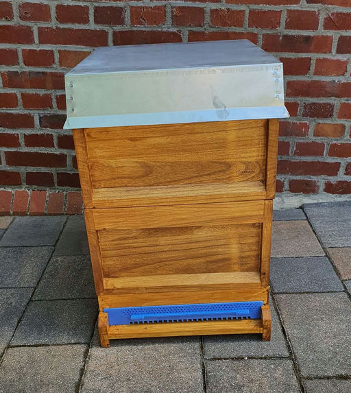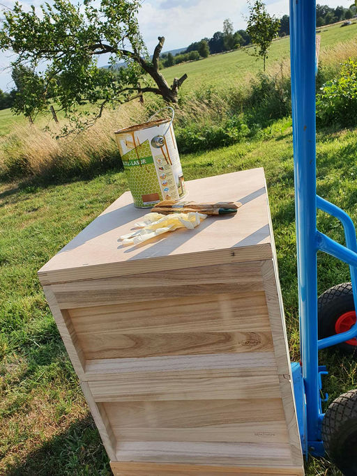 Die Beute ist bereits angekommen und gestrichen. Es ist immer aufregend, wenn ein so großer Karton vor der Tür steht. Alles, was zur neuen Bienenbehausung gehört, ist dabei. Auch die Mittelwände habe ich schon in die Rähmchen eingelötet. Somit ist alles vorbereitet, und die Bienen können einziehen.