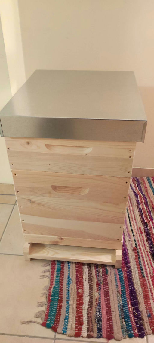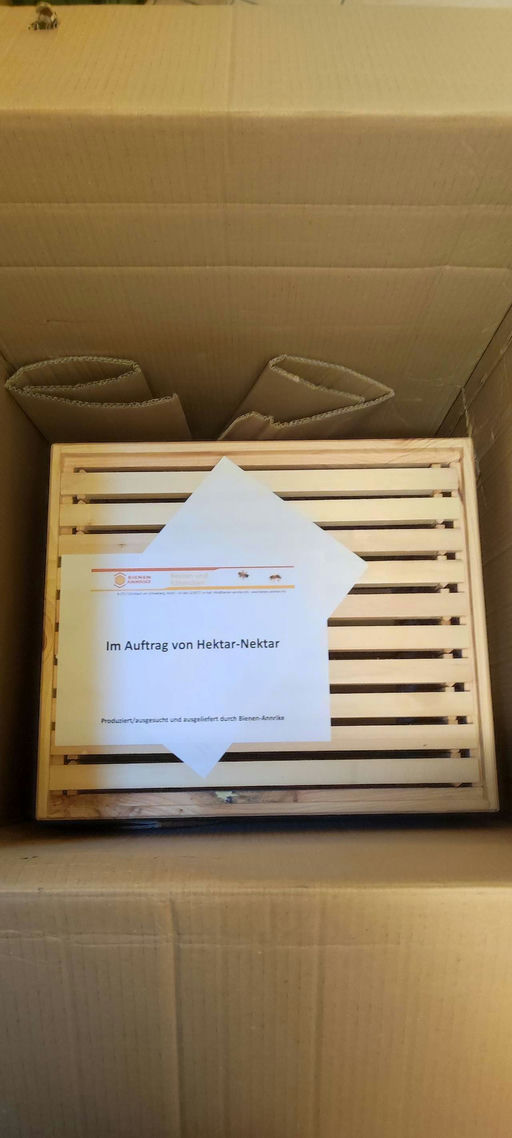 Die Beute wurde geliefert. Sie ist von sehr guter Qualität und sauber gebaut. Aufgrund der Witterung musste sie drinnen ausgepackt und aufgebaut werden. Die Rähmchen im Brutraum sind mit Biowachs-Mittelwänden bestückt und eingelötet. Jetzt heißt es noch ein bisschen warten, bis die Bienen kommen. Danke an Hektar Nektar und Knusperli!