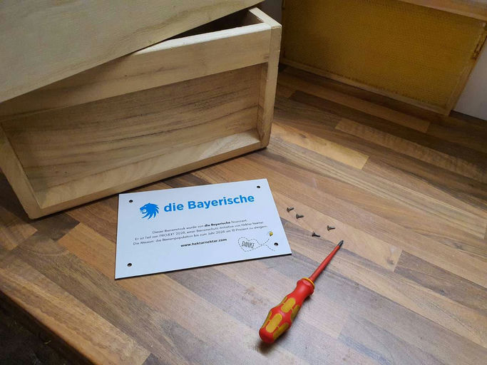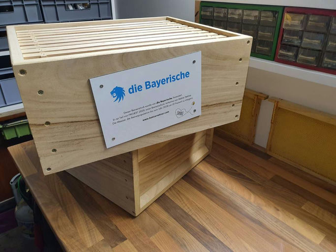 Die Beute ist nun eingetroffen, vielen lieben Dank. Im Winter bleibt jetzt noch genug Zeit, alles Nötige vorzubereiten: Drähte spannen, Mittelwände einlöten und Beuten mit einem Schutzanstrich versehen. Gegebenenfalls sollte das Anflugbrett etwas modifiziert werden, da hier sonst viel Nässe eintreten kann und Schnee lange liegen bleibt. Vielen Dank an die Bayerische, die Plakette wurde soeben angebracht.